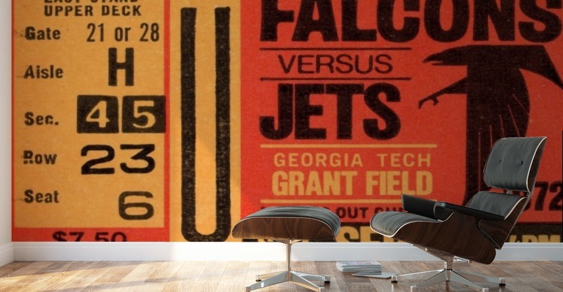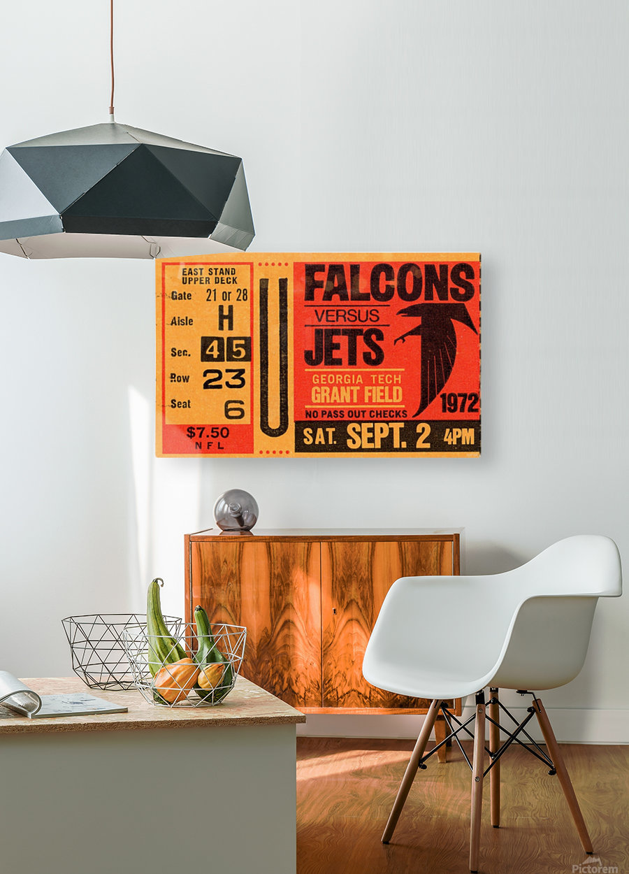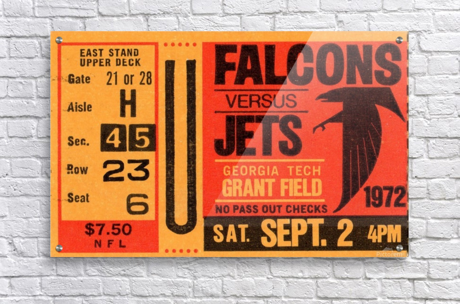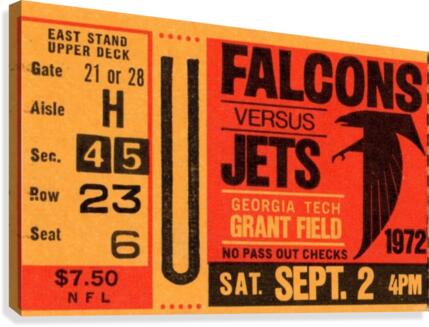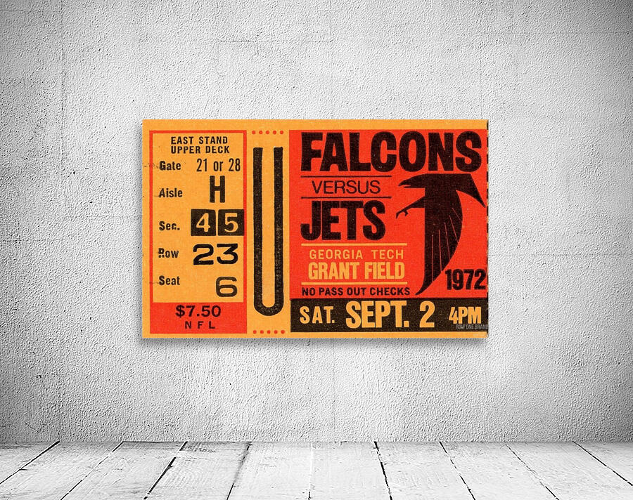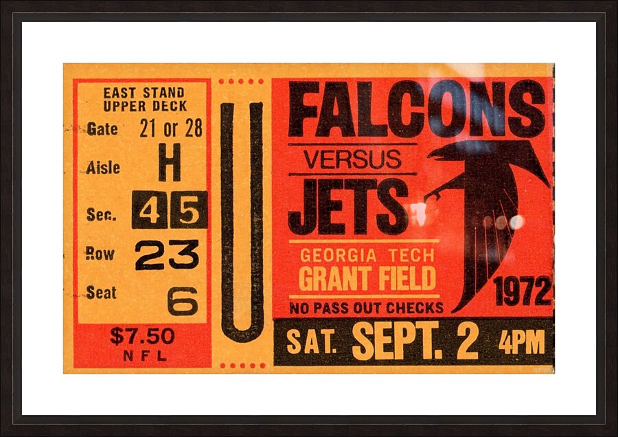 1972 Atlanta Falcons vs. New York Jets Ticket Stub Art | Row One Brand | Row One Brand's historic sports ticket art prints are not affiliated with, licensed, sponsored, authorized, or endorsed by any pro team, league, artist, athlete, venue, or any licensing entity. Only non-copyrighted memorabilia art is used by Row One to create our historic wall art prints.