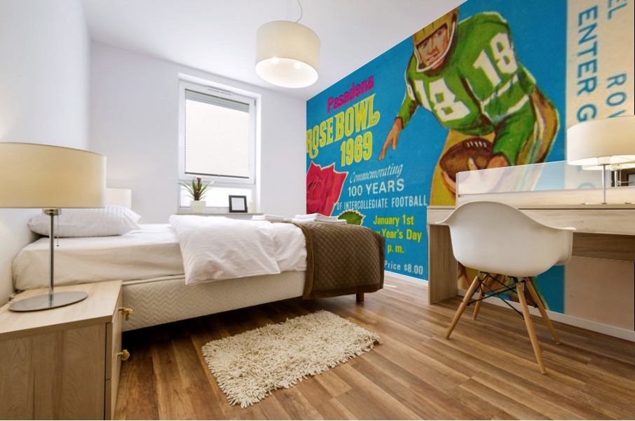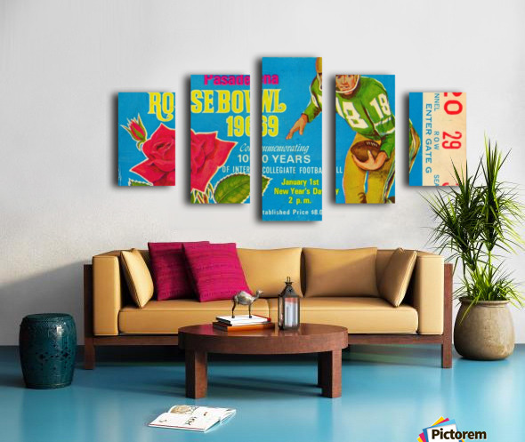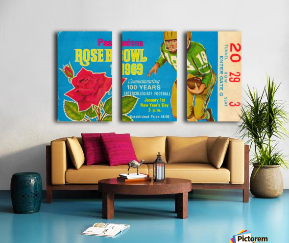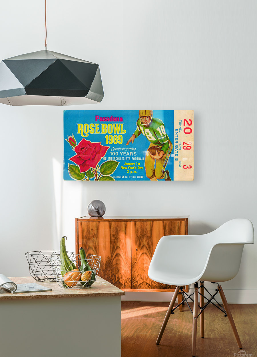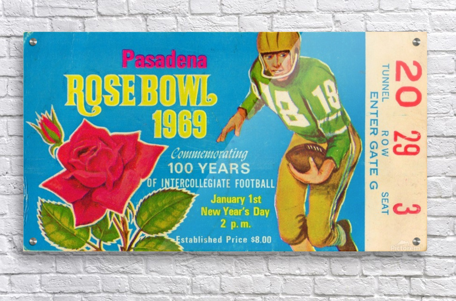 1969 Rose Bowl Football Ticket Stub Art | Row One Brand | Ohio State beat USC 27-16 to win the 1969 National Championship. Row One Brand offers sports fans the best vintage sports art reproduction prints. Our vintage sports prints are produced from historic, non-copyright sports ticket art, non-copyright program cover art, public domain photos, and other non-copyright or expired copyright public domain sports art printed materials dating back to 1876. Row One Brand scans each vintage sports image at high-resolution, digitally restores it, and meticulously crops the vintage art for maximum aesthetic wall appeal. Row One sports art posters are true conversation pieces and our vintage sports memorabilia collection is incomparable. Row One offers our vintage sports art collection in an amazing array of sizes. Our vintage sports art reproduction prints are available as a metal print, wood print, acrylic print, canvas art print, vintage sports poster, or framed sports art print. Sports fans can choose the custom frame of their choice from a selection of beautiful frames. Row One sports art is custom printed when you order. Row One Brand fine art reproductions are not affiliated with, licensed, sponsored, authorized, or endorsed by any college, university, pro team, league, event, venue, other brand, or licensing entity.