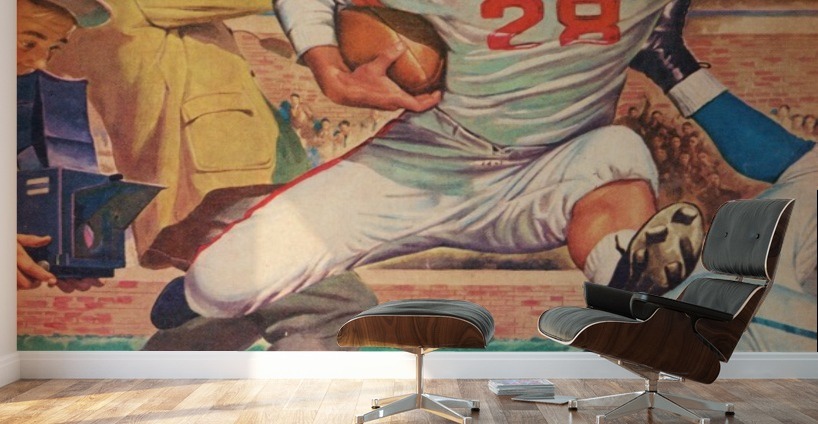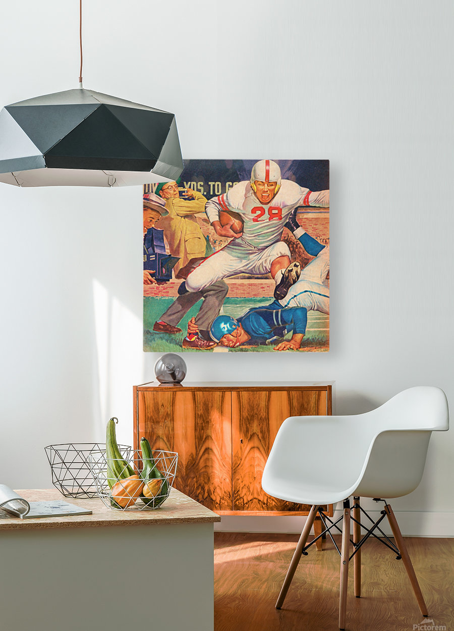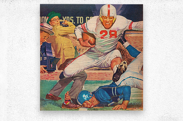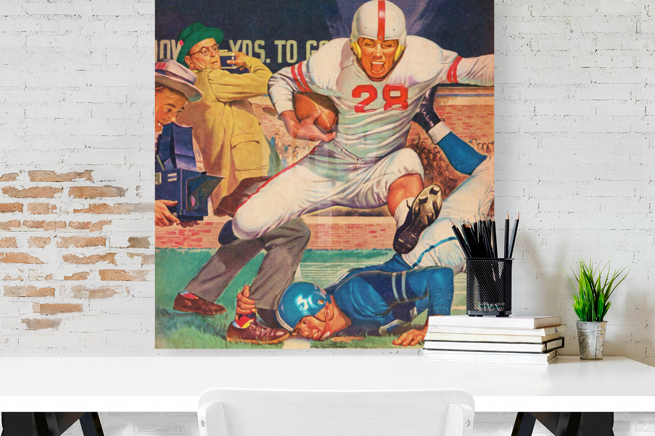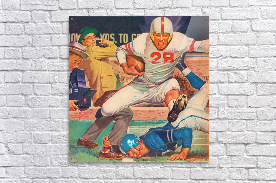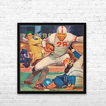 1959 Football Leap | Row One Brand | Over 11,000 Historic Sports Prints | This Row One Brand vintage football art print was created from 1959 football program cover art in our physical football program collection. Row One Brand historic vintage football art prints are not affiliated with, licensed, sponsored, authorized, or endorsed by any college, university, team, league, other artist, athlete, other brand, or any licensing entity. Only non-copyrighted memorabilia artwork is used by Row One to create our historic wall art prints. Derivative art © 2021 Row One Brand