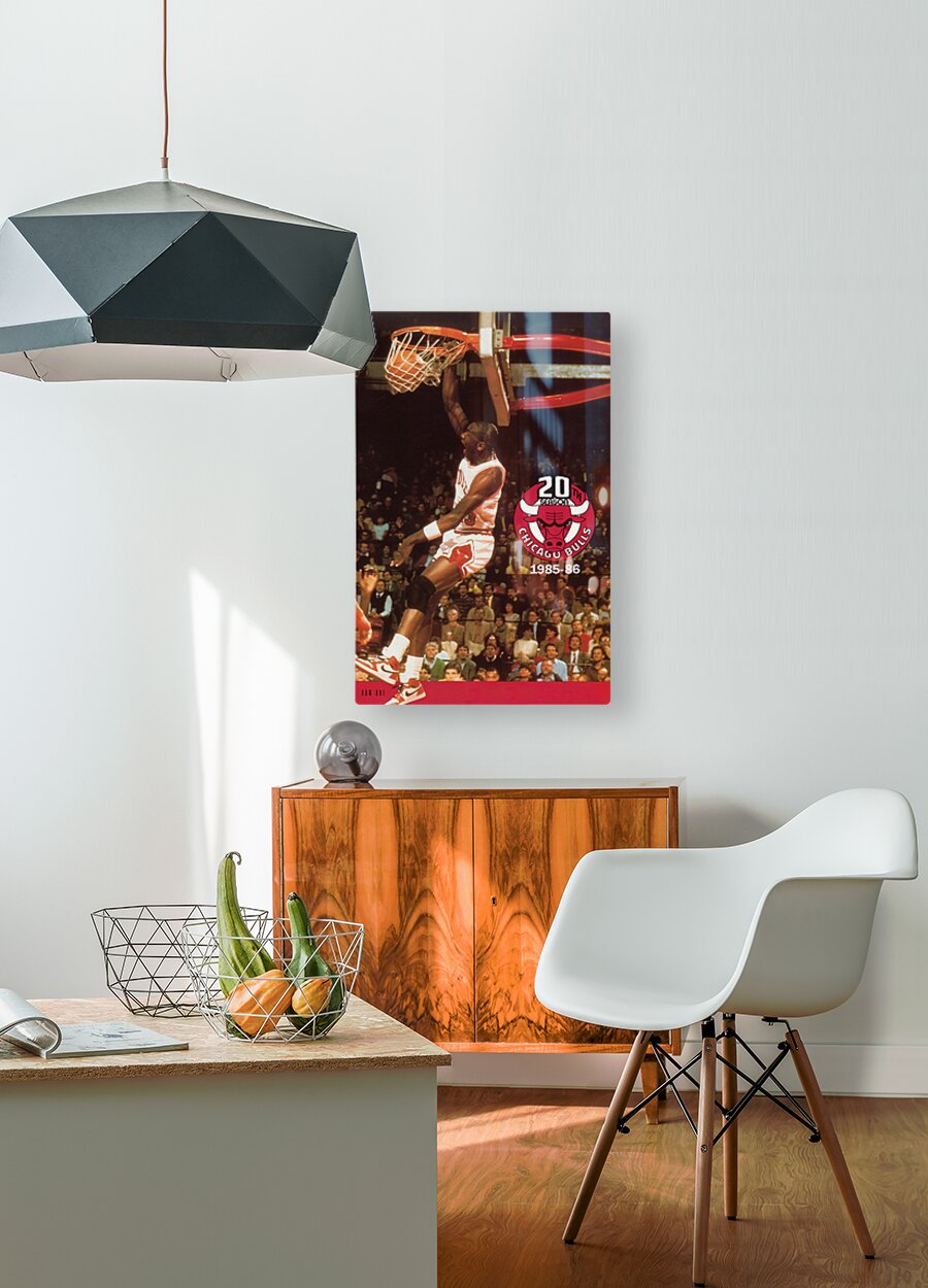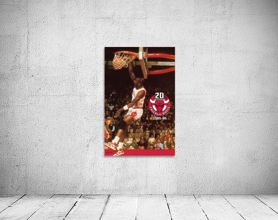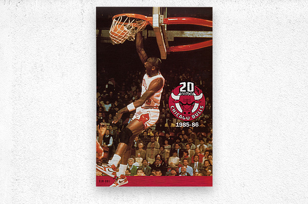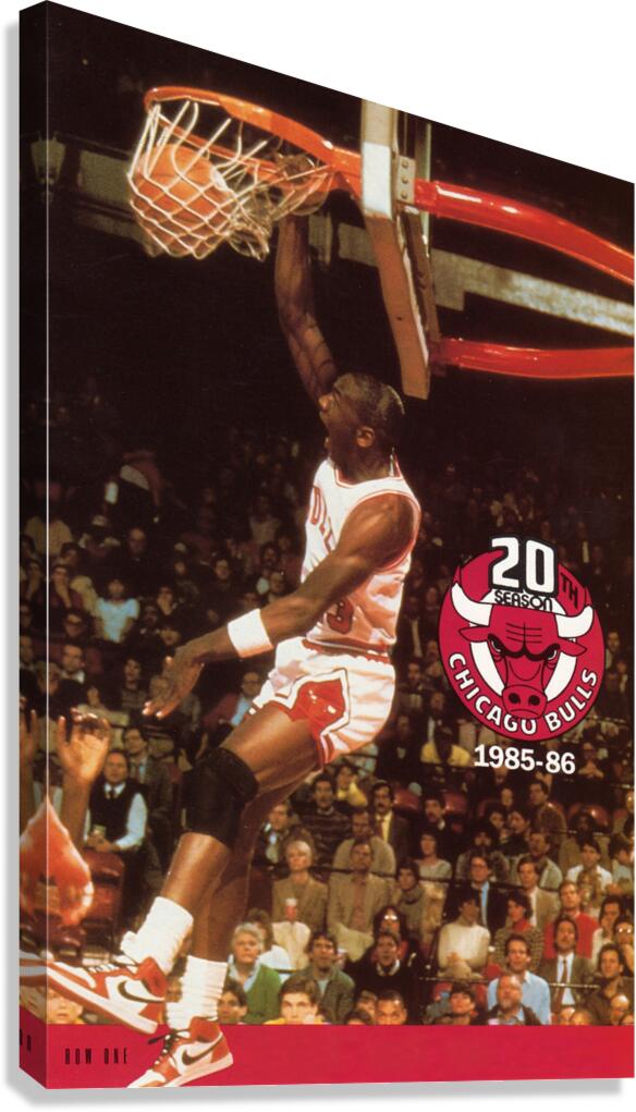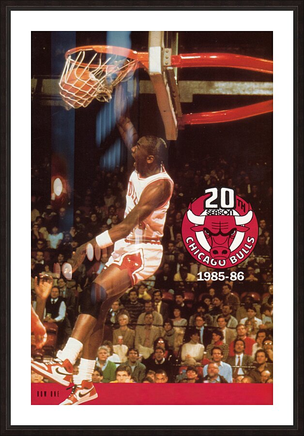1985 Michael Jordan Chicago Bulls Basketball Art | Row One Brand | Over 19,000 Historic Sports Prints | This Row One Brand Jordan art basketball print was created from authentic 1985 Chicago Bulls 20th Anniversary basketball memorabilia in our collection. Row One Brand's '85 Jordan dunk art will look fantastic in your game room or office. Row One Brand's historic sports art is not affiliated with, licensed, sponsored, authorized, or endorsed by any team, league, athlete, artist, other brand, or any licensing entity.