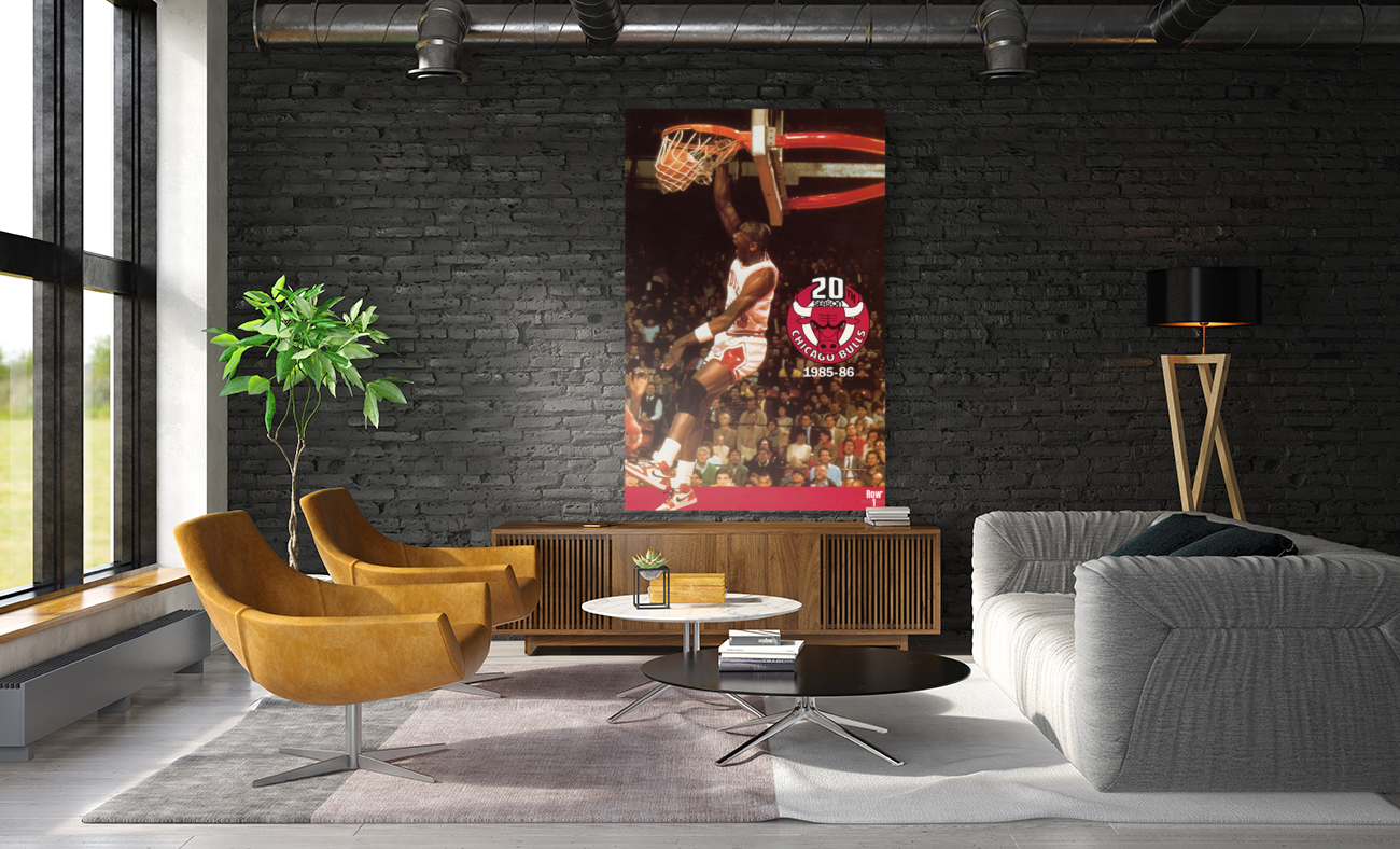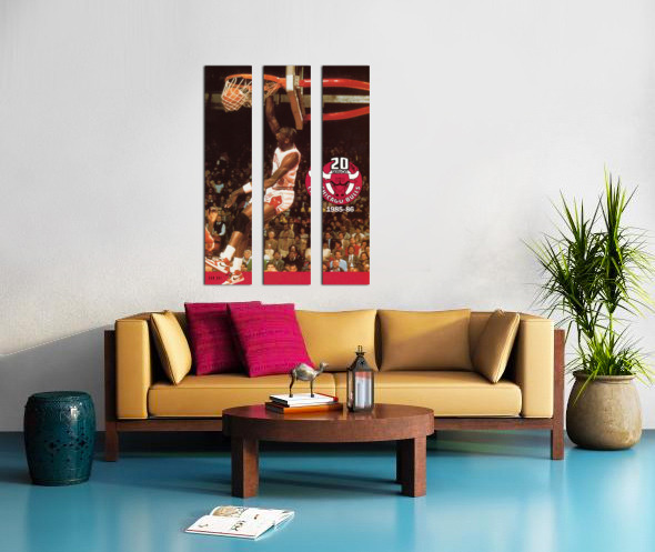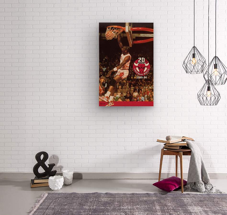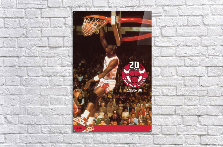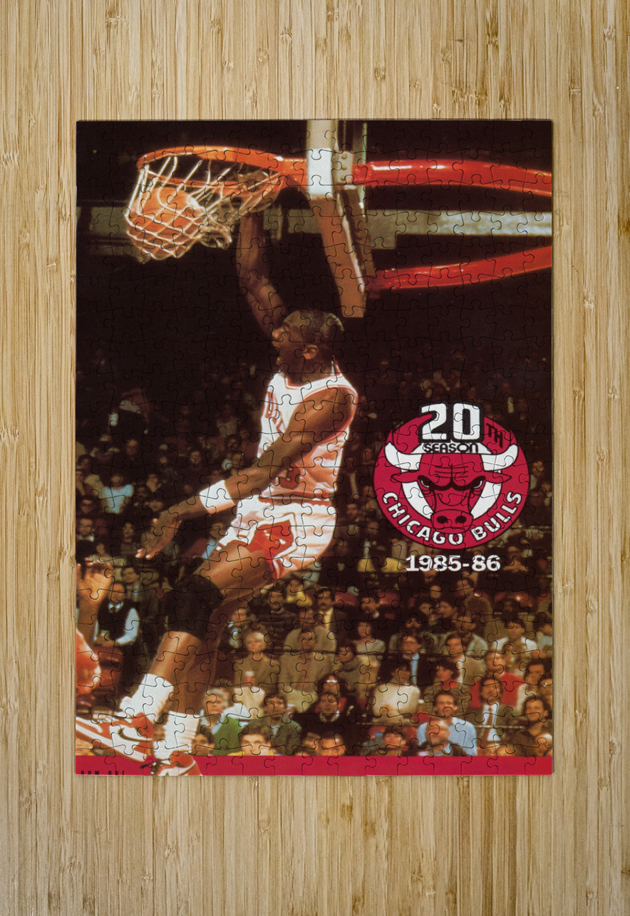 1985 Michael Jordan Chicago Bulls Basketball Art | Row One Brand | Over 19,000 Historic Sports Prints | This Row One Brand Jordan art basketball print was created from authentic 1985 Chicago Bulls 20th Anniversary basketball memorabilia in our collection. Row One Brand's '85 Jordan dunk art will look fantastic in your game room or office. Row One Brand's historic sports art is not affiliated with, licensed, sponsored, authorized, or endorsed by any team, league, athlete, artist, other brand, or any licensing entity.