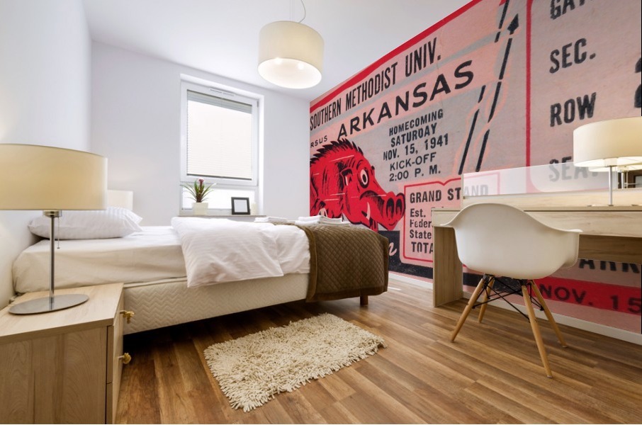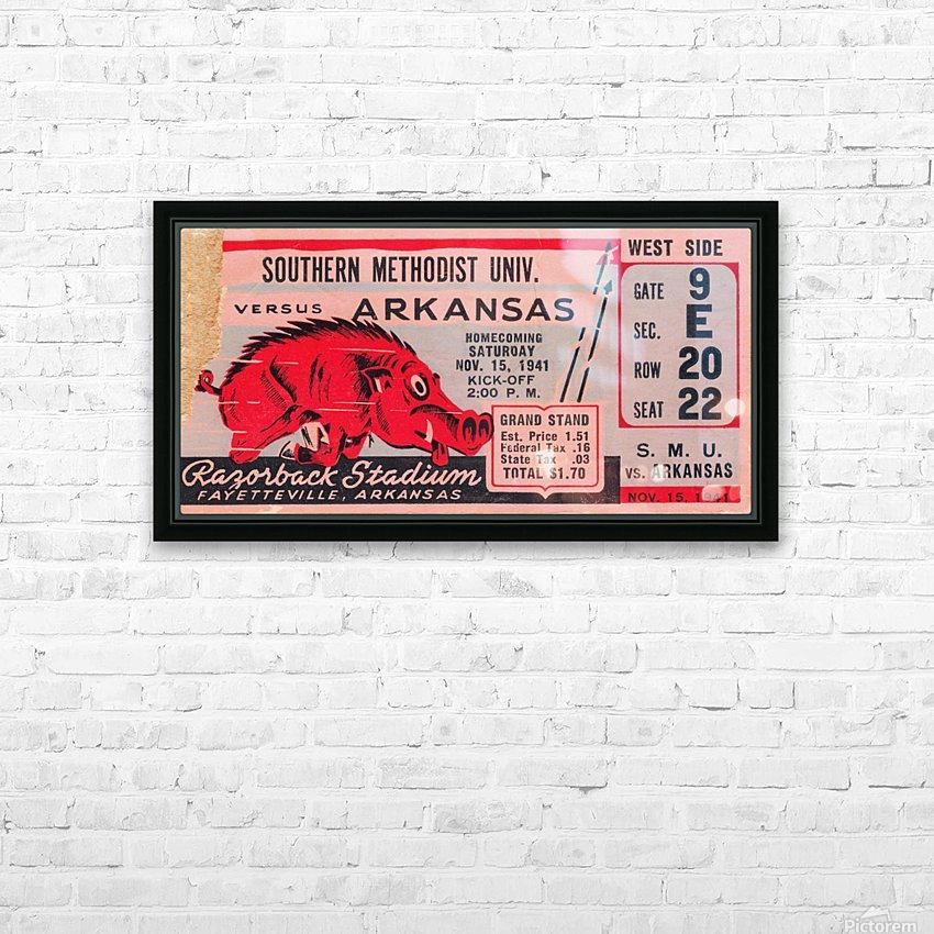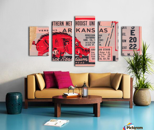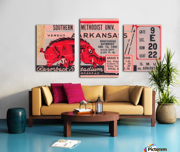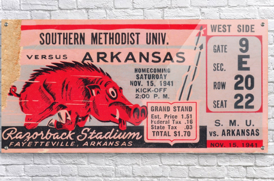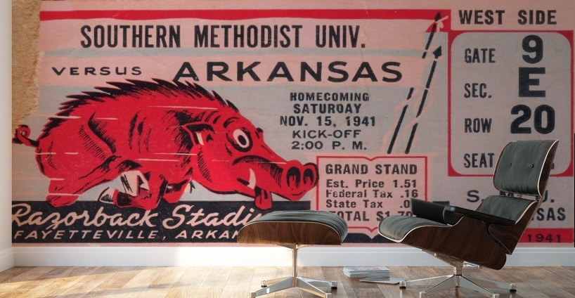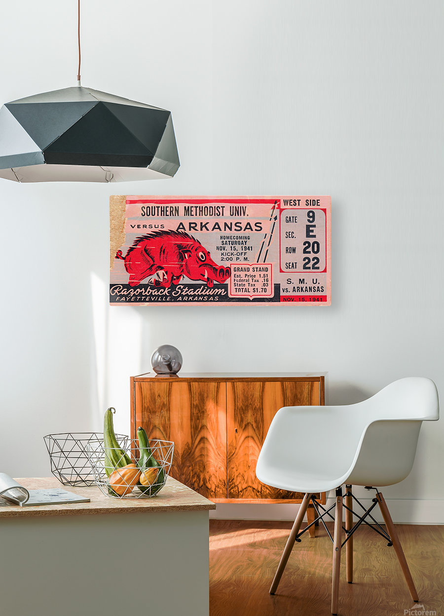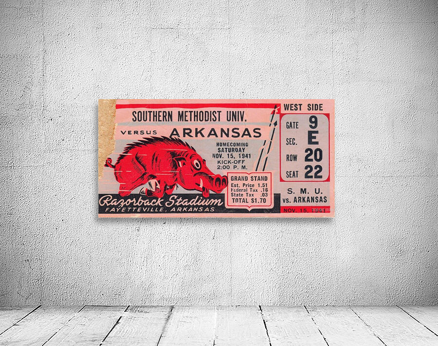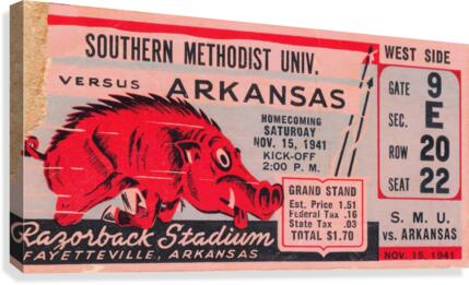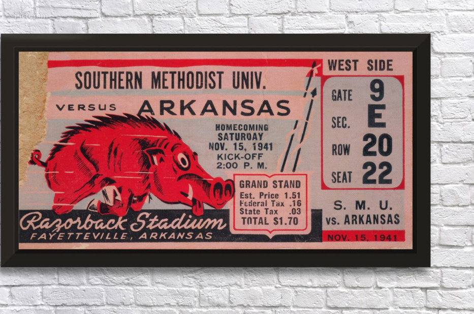 1941 SMU Mustangs vs. Arkansas Razorbacks college football ticket stub art poster by Row One Brand. | Row One | As seen on Forbes.com Americas Best Vintage Sports Art Reproductions: Row One Brand has the nations best digitally-restored historic sports ticket stub art collection and a jaw dropping vintage sports poster collection that includes sports ticket stub posters and program cover artwork done by the greatest sports artists from the 20th century. These outstanding sports artists include Reuben Award winner Willard Mullin, sketch artist Howard Brodie, Cubs program illustrator Otis Shepard, Elmer Wexler, John Cullen Murphy, Charles M. Kerins, legendary Lon Keller, Ted Watts, New York Giants Program Cover Art illustrator Carol Johnson, and Los Angeles sports artist Karl Hubenthal. Everything you see in this gallery is available for purchase. Row One meticulously crops and digitally restores each piece of sports history. The finished artwork is a vivid, colorful, collectible work of sports art. The Row One Brand sports art collection consists of exceptional vintage sports posters and giclee sports art reproductions, vintage ticket stub reproduction art, vintage football program cover art, sporting event program cover art, historic baseball scorecard art, historic basketball art, vintage hockey art posters, vintage boxing art, vintage sports ads, legendary athlete artwork, Hall of Fame coach art, vintage Coke sports ad reproductions, and other historic sports art reproductions in a wide variety of formats. Row One also offers history buffs and pop culture lovers a variety of vintage automobile ads, vintage restaurant ads, vintage beer ads, and retro shoe advertisements that appeared in the gameday programs from yesteryear. The Row One Brand vintage sports art collection is a complete retro gameday experience. Row One vintage sports art options include canvas sports art, vintage sports posters, vintage sports art HD metal prints, sports art printed on wood, custom framed sports posters with a wide array of frame options, and eye-catching sports art murals. Row One sports artwork is available in oversized art options and as big sports murals and wall decals. Founded in 2013, Row One has been featured on Forbes.com and our companys other brand, Coolstub, which offers over 1,200 unique sports gifts, watches, and apparel, was featured on ESPN.com. Row Ones sports art choices also include beautiful watercolor style sports art and abstract sports art pieces. Row One Brands historic sports art is digitally restored for vibrant color and perfectly cropped for maximum aesthetic appeal. We take our art seriously and Row One never cuts off key words, dates, or important aspects of the artwork except in rare cases when it adds to the visual aesthetics. Row Ones sports art collection is the perfect sports art solution for interior designers looking for big corporate sports art pieces or fans looking for everything from affordable sports posters to expensive luxury sports art. Our sports art pieces make unique gifts for sports fans and the art is ideal for game rooms and mancaves. Row One sports art even looks great in kitchens, living rooms, bedrooms, and on garage walls. Our vintage sports murals, metal prints, and prints on wood are especially good sports decor ideas for the garage. Row Ones vintage football ticket stub collection is immense and includes the best college football ticket stub art designs dating back to an 1893 Princeton vs. Penn ticket stub. Row Ones vintage college football ticket stub collection covers each decade from the 1890s through the 1980s. Row Ones college football ticket stub collection includes the 1966 Michigan State vs. Notre Dame Game of the Century ticket stub, 1969 Arkansas vs. Texas Game of the Century ticket, and 1971 Oklahoma vs. Nebraska Game of the Century ticket stub. Row One Brand has college football ticket art for all major colleges. Our college art collection includes football ticket stub art for the University of Alabama, University of Michigan, USC Trojans, and UCLA Bruins. Row One has Georgia Bulldogs ticket stub art, Texas Longhorns football art, Notre Dame football ticket stub art prints, Oklahoma Sooners football ticket art, Ohio State Buckeyes art, Oregon Ducks wall art, Washington Huskies football art, Florida Gators ticket artwork, Nebraska Cornhuskers vintage ticket prints, and Tennessee Vols football ticket stub wall decor. Row One also has historic NFL ticket stubs, vintage baseball scorecard art, and vintage NBA ticket stubs in its ticket art collection. Row One offers sports fans other rare sports memorabilia art reproductions including old sports pocket schedule art, vintage sports decal art, and vintage football media guide art. In addition, Row One is adding hundreds of unique vintage sports advertisement reproductions from all eras. Row One historic sports art reproductions are created only from non-copyright, public domain sports art. A small, translucent aesthetically-pleasing Row One wordmark logo is printed in the lower corner of each sports art reproduction print. Row One is not affiliated with, licensed, sponsored, authorized, or endorsed by any college, university, team, league, event, other brand, or licensing entity. All fine art prints are reproductions of historic, non-copyright or expired copyright printed publication designs in the public domain. Row One takes intellectual property matters seriously. If you have a valid copyright complaint for one of our fine art pieces, please contact us through https://rowonebrand.com/ with your copyright renewal information so we can address the issue properly. Row One Brand derivative art designs © Copyright Row One Brand 2020
