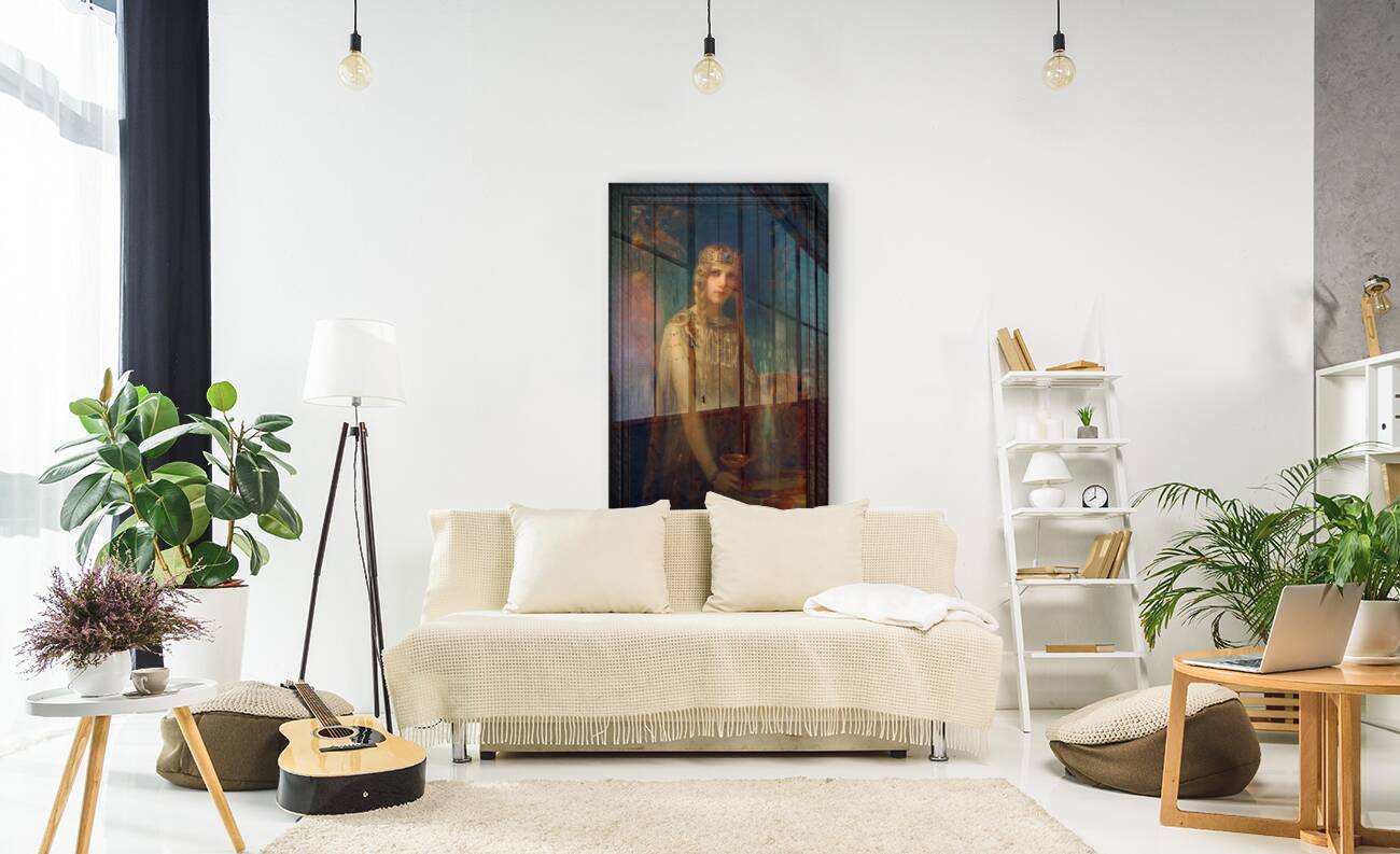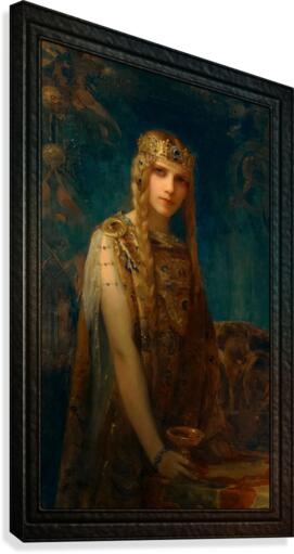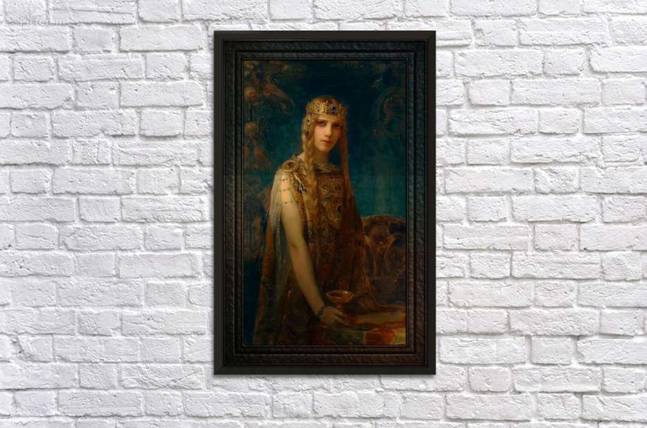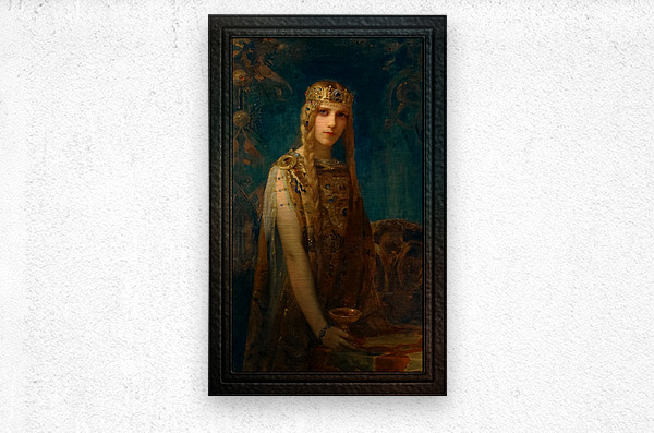 La Princesse Celte (The Celtic Princess) c1911 by French Painter Gaston Bussière (1862 - 1928); a painter and illustrator of the Symbolist Style, as well as a student of Alexandre Cabanel and Pierre Puvis de Chavannes at the École des Beaux-Arts de Paris. A Celtic Princess standing by a table with a wine goblet in hand wearing her crown. This is a retouched digital art old masters reproduction of a public domain image.