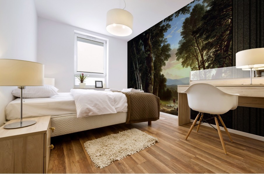 The Beeches c1845 by American Painter & Engraver Asher Brown Durand (1796 - 1886) was part of the Romanticism Art Movement and was a graduate of the Hudson River School. Ashers main focus was on landscape paintings. This beautiful and tranquil forest scene with a sheep herder walking his sheep down a dirt road toward a lake shows finely rendered beech and basswood trees in all their glory. The painting was commissioned for the New York collector Abraham M. Cozzens; at the time a member of the executive committee of the American Art Union; and is the first work by Durand to use the Plein-Air Oi; sketch technique, which allowed artist to produce accurate light effects in their artwork. This is a retouched digital art old masters reproduction of a public domain image.