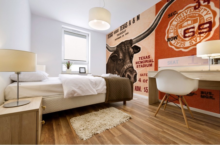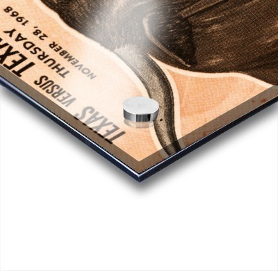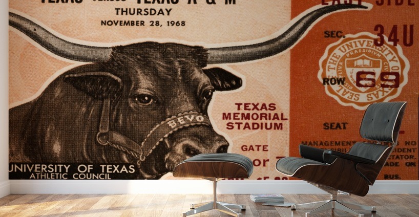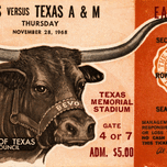 1968 Texas Longhorns football ticket stub wall art by Row One Brand. Classic Texas Longhorn art from the Darrell Royal era in Austin. Not affiliated with, licensed, sponsored, or endorsed by any college, university, team, league, artist, other brand, or licensing entity. Derivative art © Copyright 2020 Row One Brand