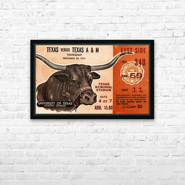 1968 Texas Longhorns football ticket stub wall art by Row One Brand. Classic Texas Longhorn art from the Darrell Royal era in Austin. Not affiliated w...[+]