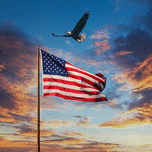 AMERICAN FLAG ON OLD FLAGPOLE AT SUNSET WITH EAGLE