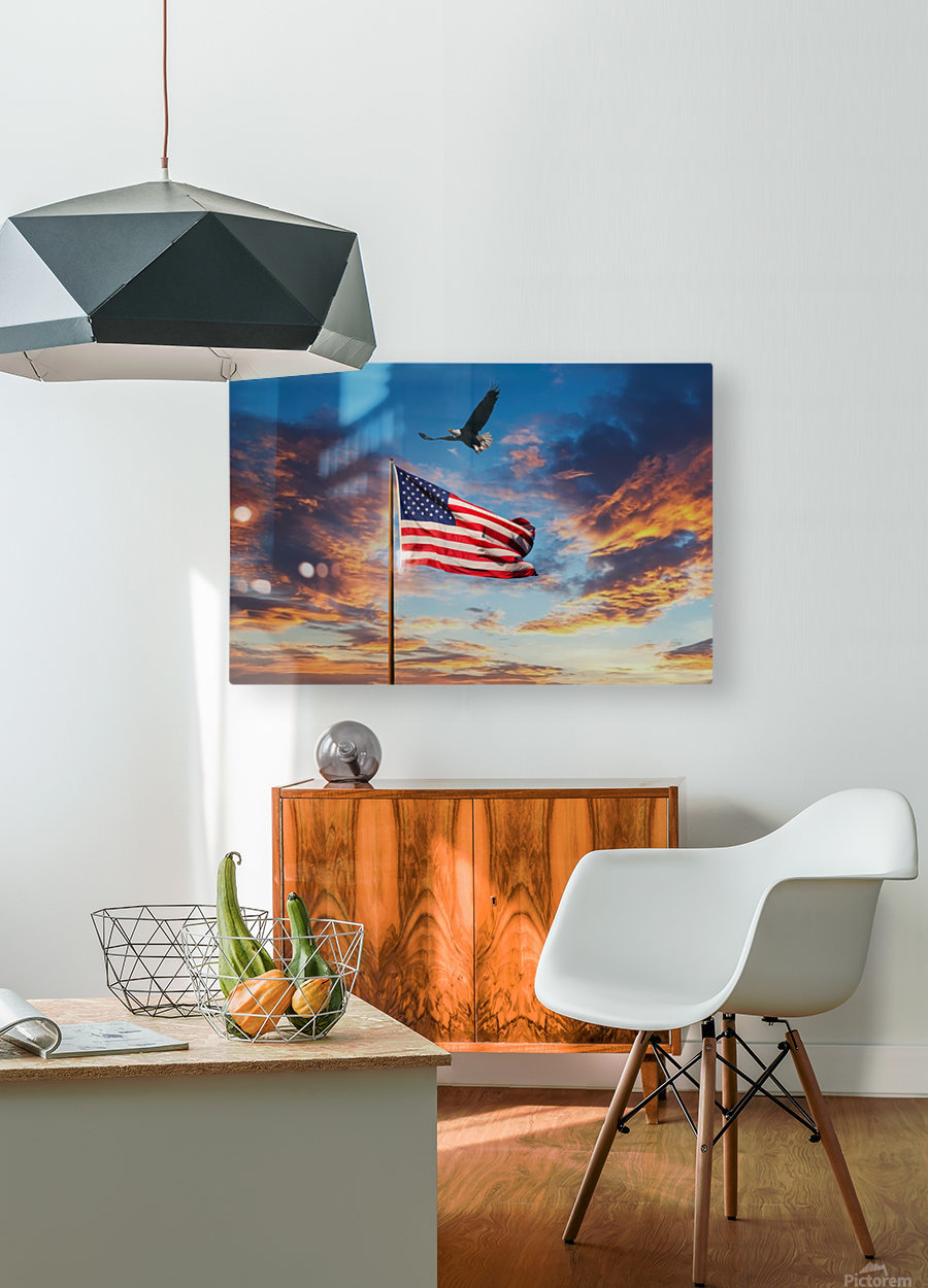 ABOUT THIS ARTWORK: AMERICAN FLAG ON OLD FLAGPOLE AT SUNSET WITH EAGLE
