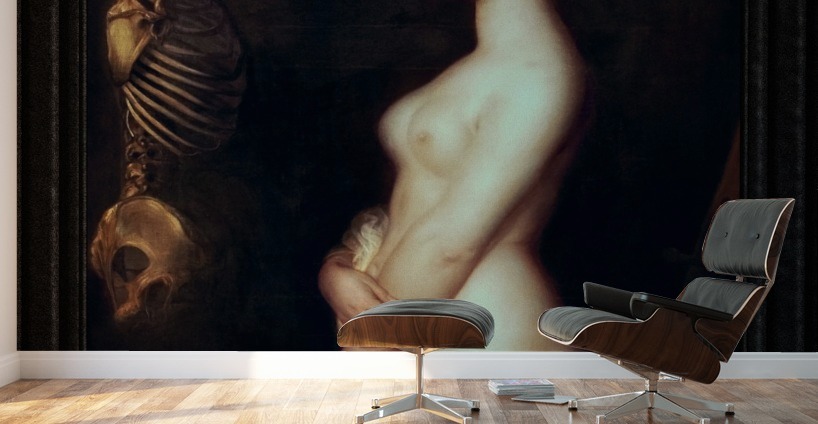 Two Young Girls or The Beautiful Rosine c1847 by Belgian Painter Antoine Wiertz (1806 - 1865) and sculptor of the Romantic Period. A beautiful young model stands and stares at a hanging female skeleton as she poses in a painters and sculptors studio. Below low the skeleton a broken pieces of a sculpture and to behind the model one can see part of a painters easel and the painting palette. This is a retouched digital art old masters reproduction of a public domain image.