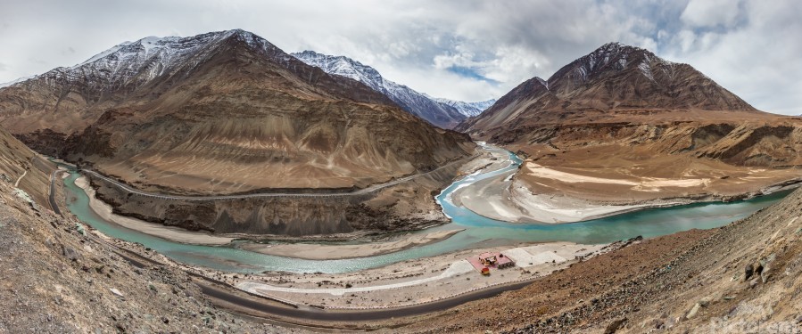 This is a confluence of the Indus and Zanskar rivers photographed during the winter near Leh, Ladakh in India. This is a panoramic view of several shots photographed to give the intimate feel of the landscape and scale of the mountains around it.