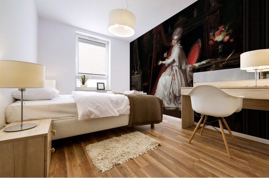 A Lady Playing on the Harp c1779 by British Painter Richard Cosway (1742 - 1821), a noted miniaturist and portrait painter of the Regency Era. The Lady Playing The Pedal Harp is Marianne Dorothy Harland (1759 - 1785), as she sits between two tables with chairs with her back to a large fireplace with vases on the mantle which also supports a large mirror, as her dog sleeps by her side near a guitar that is leaning on a bench by one of the tables that has a vase full of flowers. She is the second daughter of Admiral Sir Robert Harland, first Baronet of Sproughton Hall; and who would later become Mrs. William Dalrymple. This is a retouched digital art old masters reproduction of a public domain image.