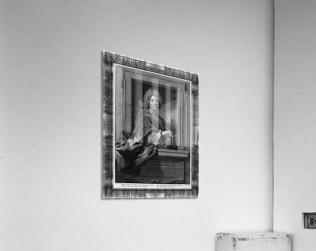 Nicolas de Largilliere by French Engraver François Chereau (1680 - 1729) c1715 from a painting by French Painter Nicolas De Largillerre (1656 - 1746), one of Europes premier portrait painters as well as an historical and still life painter during the late 17th century and the first 40 years of the 18th century. This engraving shows Nicolas de Largillerre sitting by a glassless window looking at the viewer, with his right hand that is holding a drawing implement draped over a portfolio while his left hand points towards a painting he's working on that is placed on an painting easel. Just below the sill of the window are the words NICOLAVS DE LARGILLIERE IN REGIA PICTVRAE ACADEMIA PROFESSOR followed by a description in script... This is a retouched digital art old masters reproduction of a public domain image.