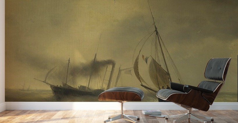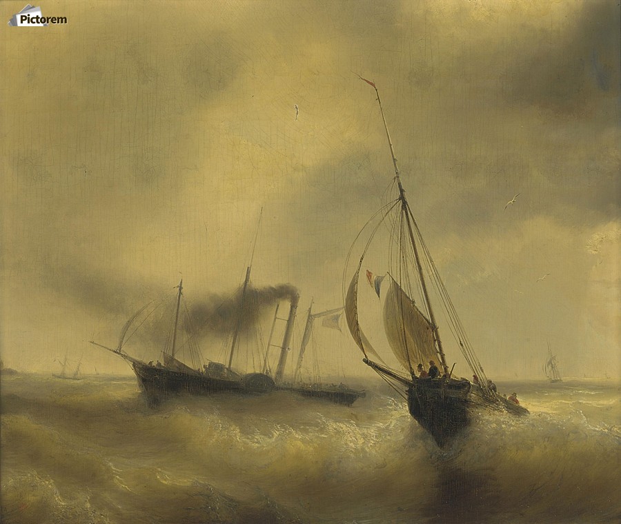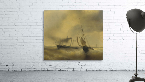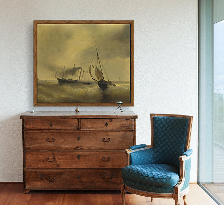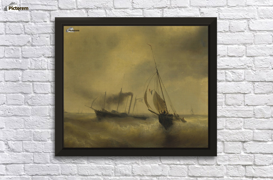 Get this artwork "A paddle steamer passing a French fishing vessel in rough waters" in a framed print.