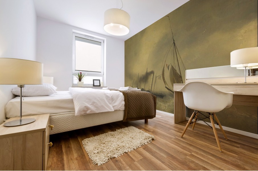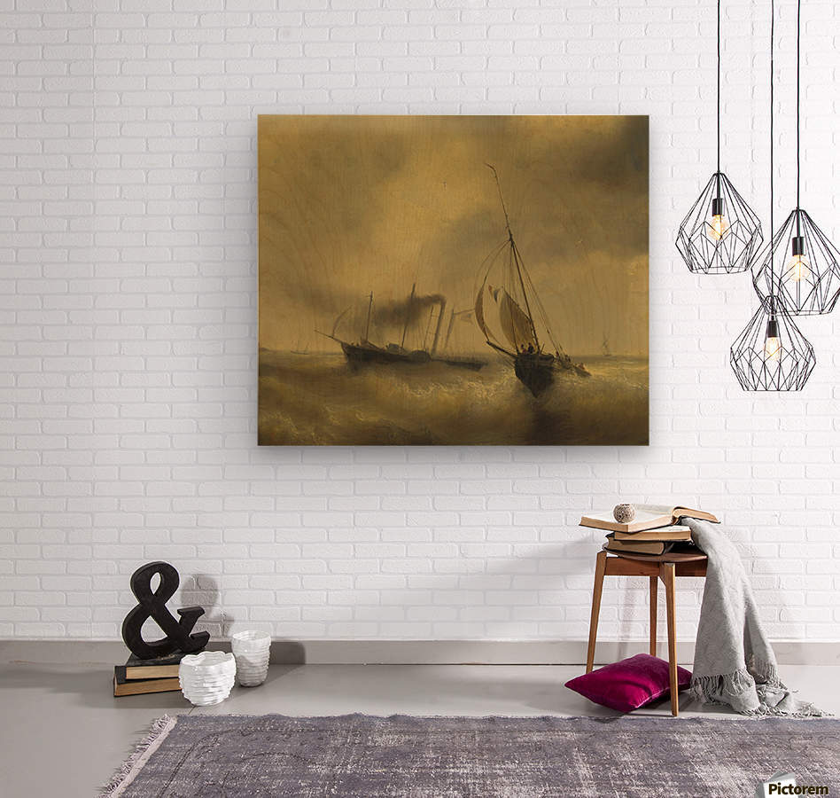 A paddle steamer passing a French fishing vessel in rough waters  Wood print