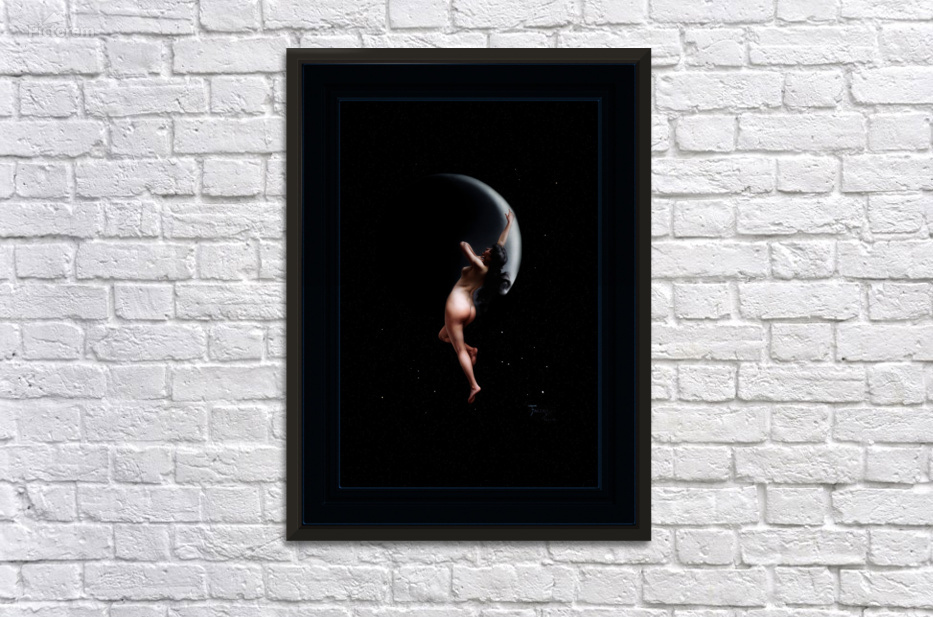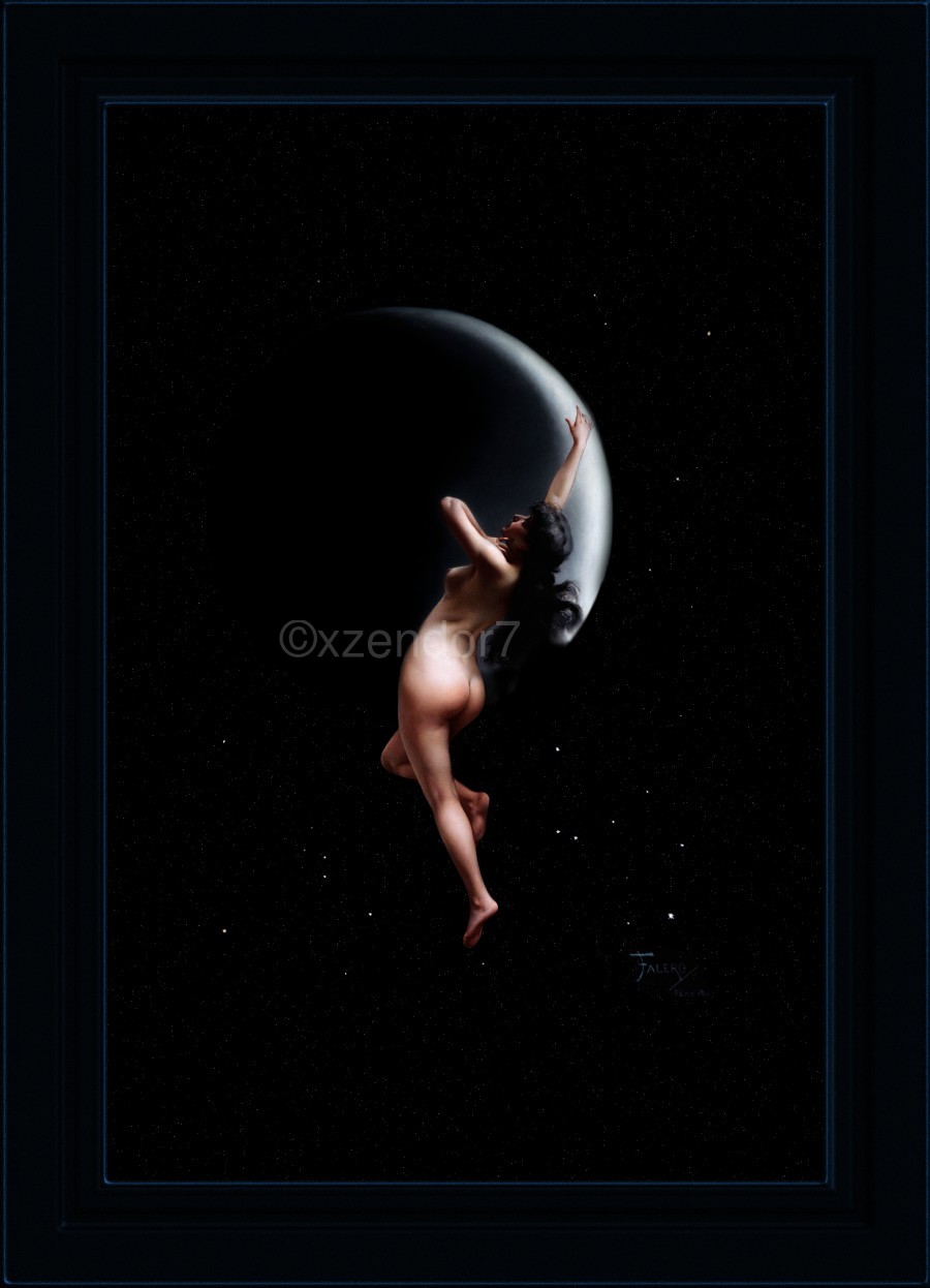 Moon Nymph c1883 by Spanish Painter Luis Ricardo Falero (1851 - 1896), specializing in female nudes, mythological, oriental and fantasy art creations; incorporating his interest in astronomy into many of his artistic creations. This fantasy portrait by Falero has a Moon Nymph in space in front of the Moon which is mostly in shadow, with her right hand stretched out toward the moon; while she is touching her neck with her left hand. I took the liberty with this image to enhance the star background with an addition fractal star field to minimize the look of a void in the artwork. This is a retouched digital art reproduction of a public domain image.