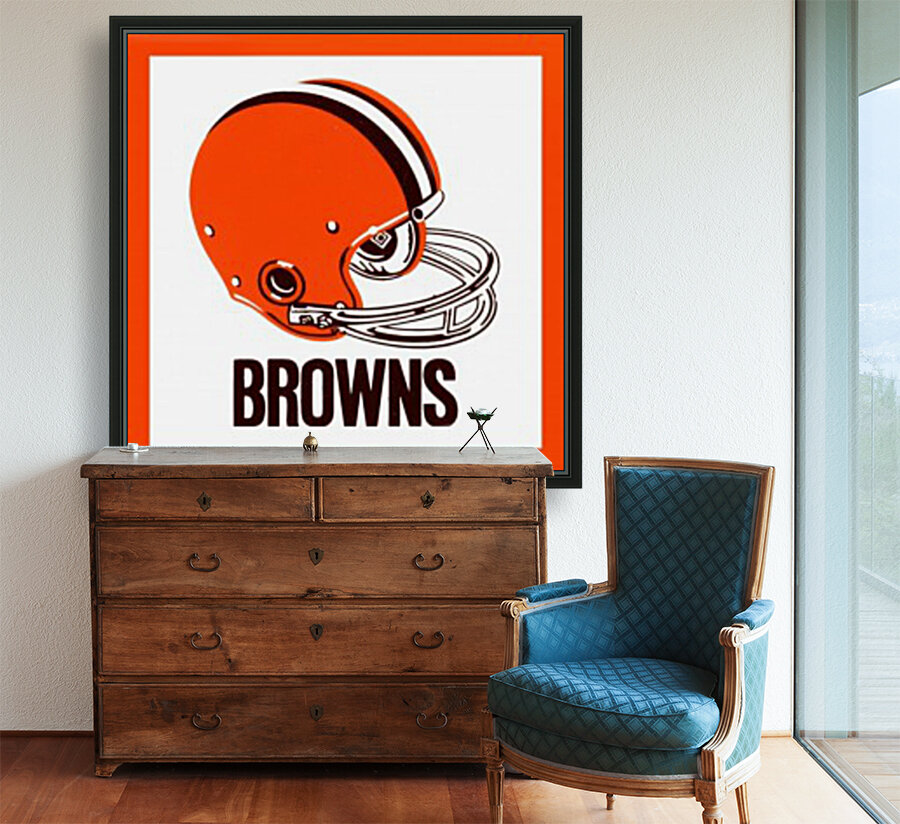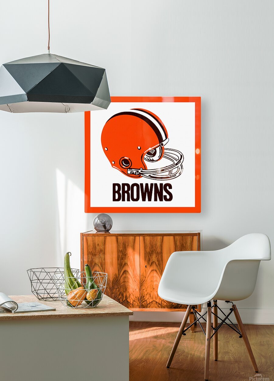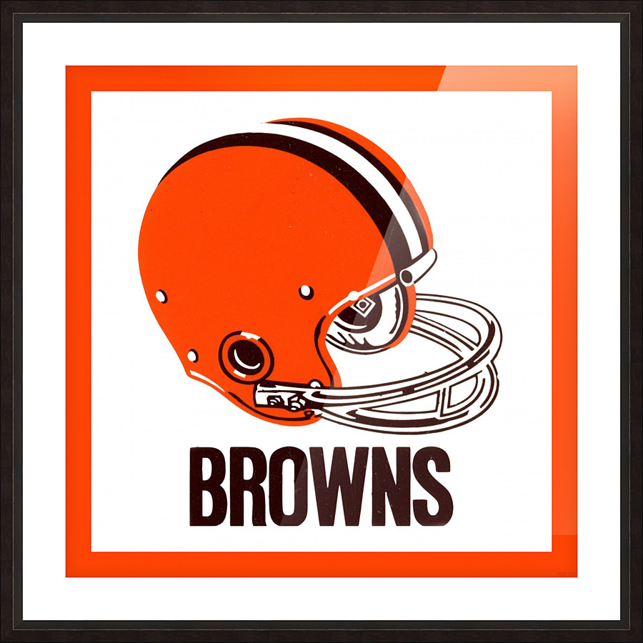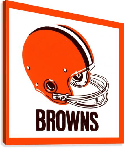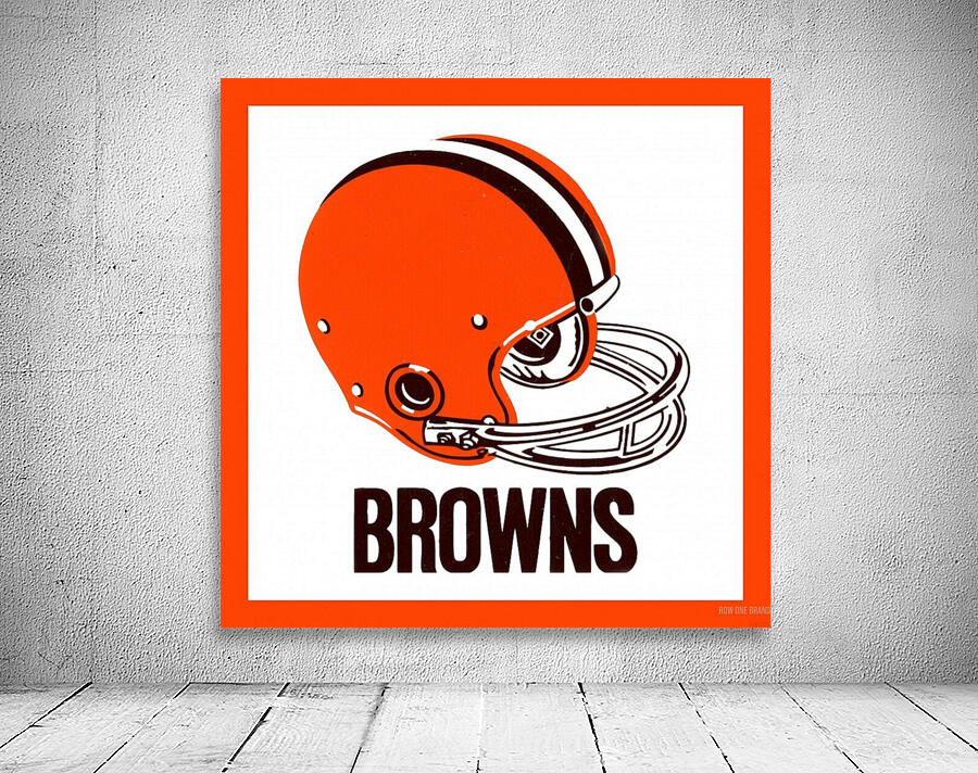 This Cleveland Browns football helmet art by Row One Brand was created from genuine 1971 Browns memorabilia. Row One Brand historic vintage football helmet art is not affiliated with, licensed, sponsored, authorized, or endorsed by any team, league, artist, athlete, other brand, venue, or licensing entity. Only non-copyright and expired copyright publications are used to create Row One Brand art. Translucent Row One logo printed in corner of art.