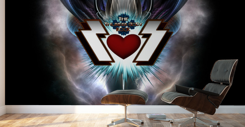 The Thunder Gods Rock Is An Album Cover Looking Graphic Design That One Might Have Seen In The Days Of Vinyl Records. With A Deep Red Heart Resting On Top Of A Aqua Blue And White Centered Star Burst Paired With Two Jagged S's On Either Side. This Is Accented With Large Fractal Ear Wings Of Blue Violet And Additional Central Fractals That Are Combined A Background Of Fractal Clouds, Fractal Lightning Bolts And A Fractal Blue Violet Orb Set Against A Black Background.