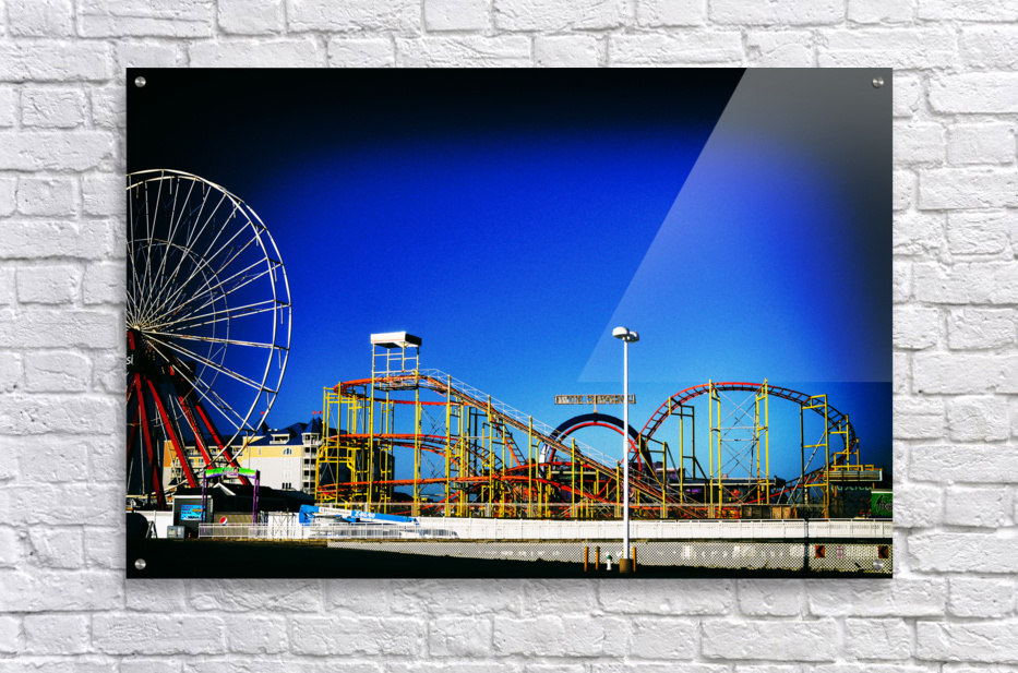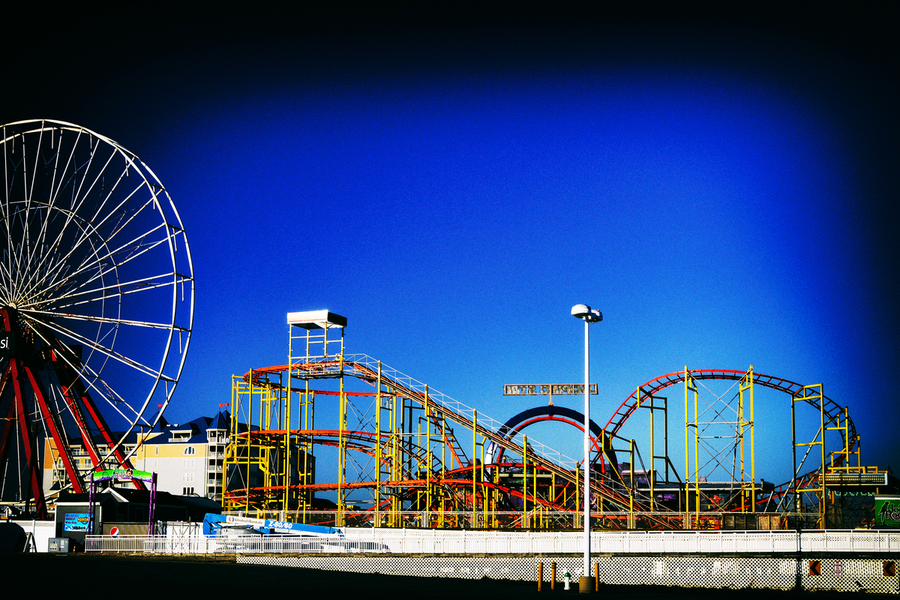 The Ocean City Amusement Pier looks stark but colorful under a golden, cool off-season sky. The pier may close and the rides may be deserted during the colder months at the beach but Ocean City, Maryland, remains open for business all year 'round. This popular image is offered in several varieties of editing. This one is called "Rembrandt" and is seen as it might exist on a cold winter afternoon. If you choose this one, where will you hang it? Order yours today.