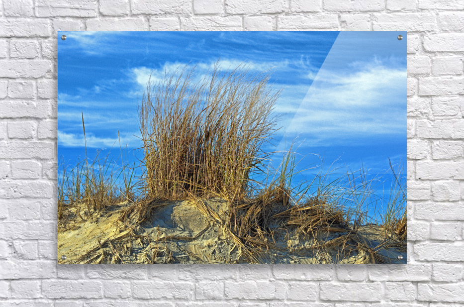An autumn sun highlights these dune grasses (American Dune Grass) standing tall into the blue sky filled with cirrus clouds on a beautiful fall day. This particular clump of dune grass was captured along the beach at the Fenwick Island State Park in coastal Delaware. These grasses help protect the island from the relentless encroachment of the Atlantic Ocean as its waves crash along the beach. The roots have a symbiotic relationship with microbes in the sandy soil and spread tendrils through the sand to help keep from being covered by wind-blown grains of sand.