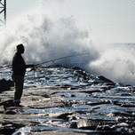 A solo, intrepid fisherman shows his dedication for the sport by braving the high waves and crashing surf of the Atlantic Ocean on the Inlet Jetty at ...[+]