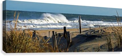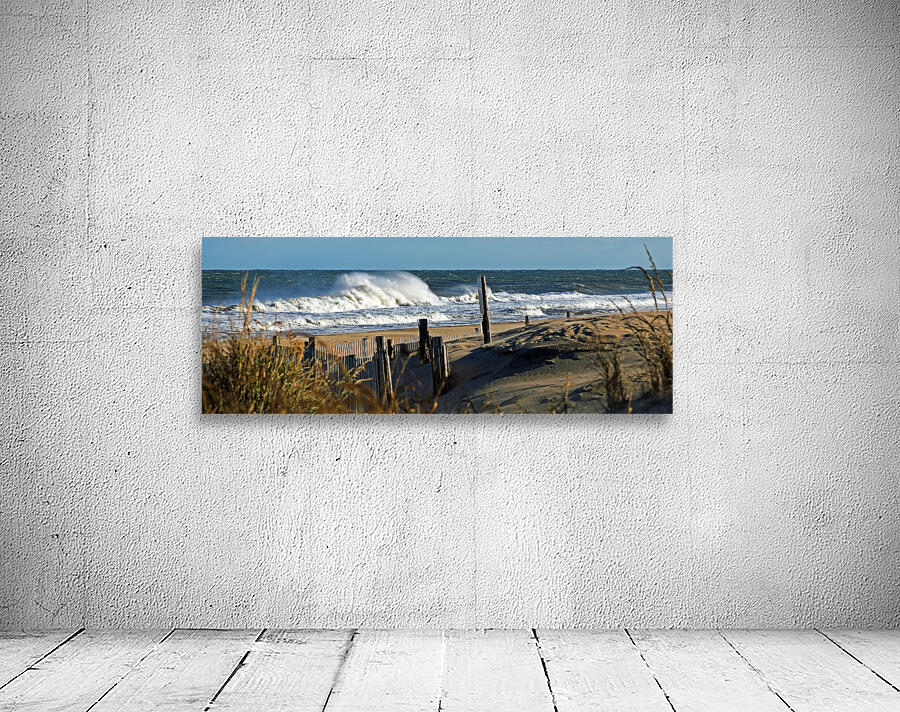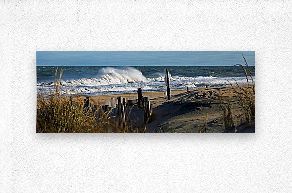 Just north of Ocean City, MD, autumn winds play in the wild surf along the Atlantic beach of Fenwick Island State Park, just north of the towns of Ocean City, Maryland, and Fenwick Island, Delaware. In this panorama beach scene, the sky reflects the chill in the air and the deep blue-green of the Atlantic Ocean while the dunes display the golden hues of beach grasses in the Fall. As a reminder of your good times at the beach, where would you display this in your home?