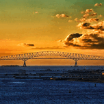 Shortly after sunrise an orange-hued dawn sky silhouettes the Francis Scott Key Bridge against a dramatic sky. The "Key Bridge" is the longest bridge ...[+]