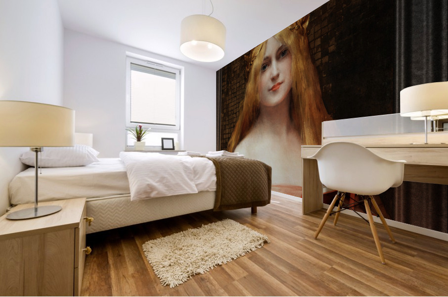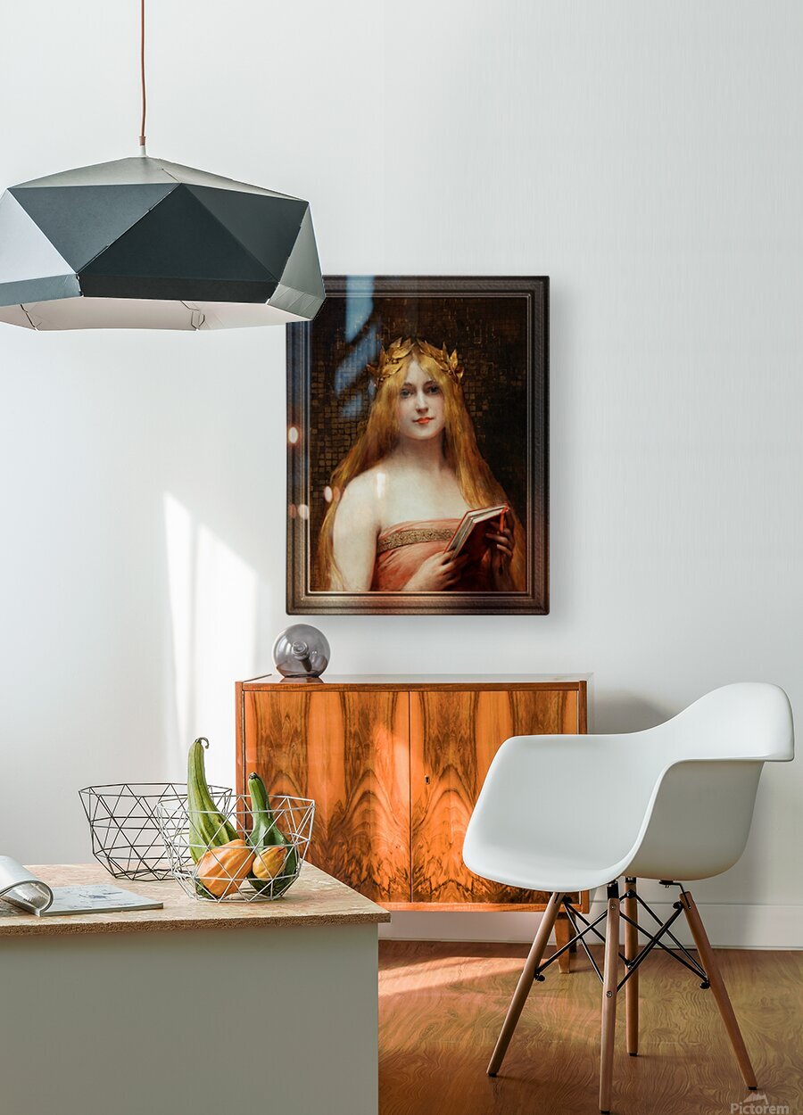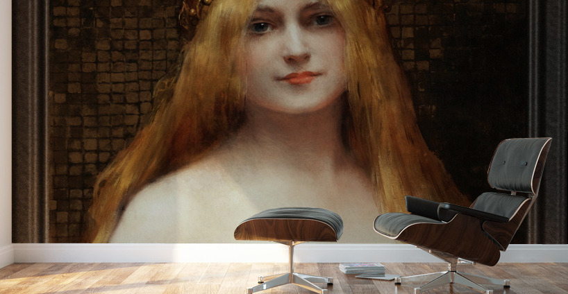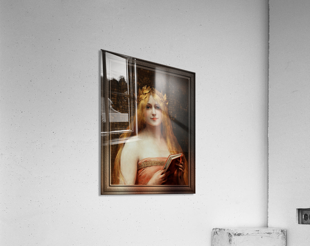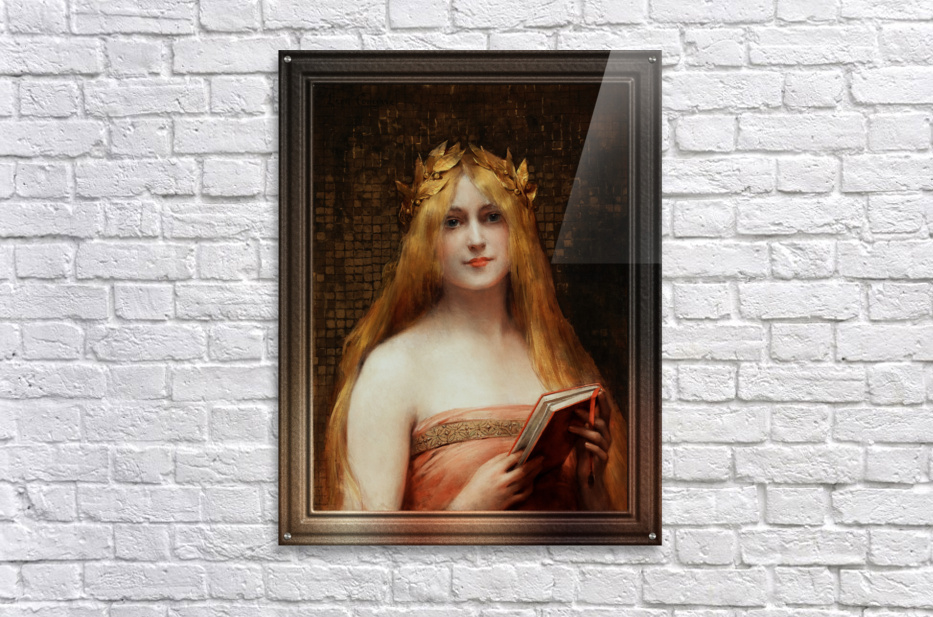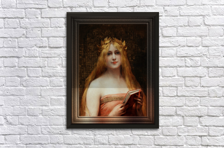 A Classical Beauty by French Painter Léon Comerre (1850 - 1916) an Academic Painter that was famous for his beautiful female portraiture as well as his Oriental Themed Artwork. A portrait of a beautiful blonde young lady wearing a gold laurel leaf crown on head with flowing golden blonde hair, wearing a rose dress and holding a reading book in her hands; standing in front of a distressed ancient golden tile wall. This is a retouched digital art old masters reproduction of a public domain image.