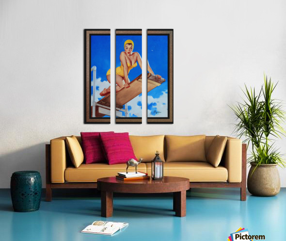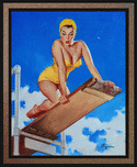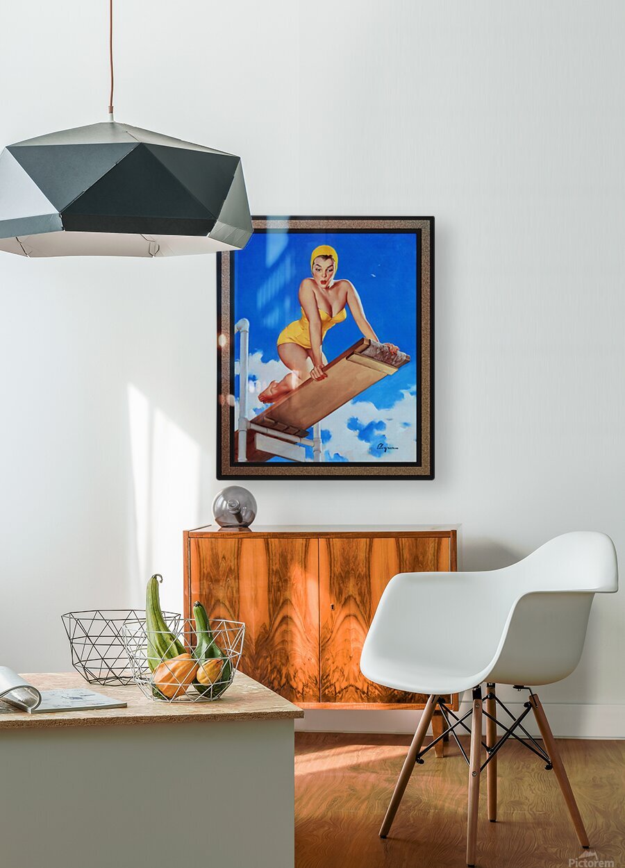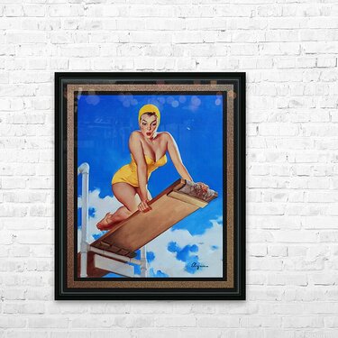 I Think Not by American Painter Gil Elvgren (1914 - 1980); painter, illustrator and pin-up girl artist. I Think Not shows a stunning full figure pin-up girl in a yellow swimsuit and hair cap, kneeling on a diving board; as she looks down at the pool re-thinking diving into the pool from such a height, as she realizes the way down is very long indeed. This is a retouched digital art old masters reproduction of a public domain image.