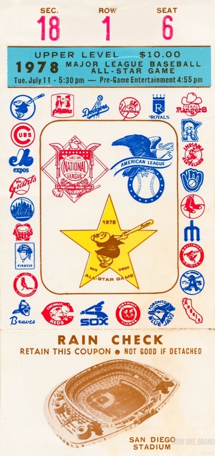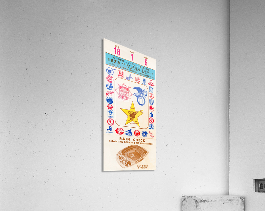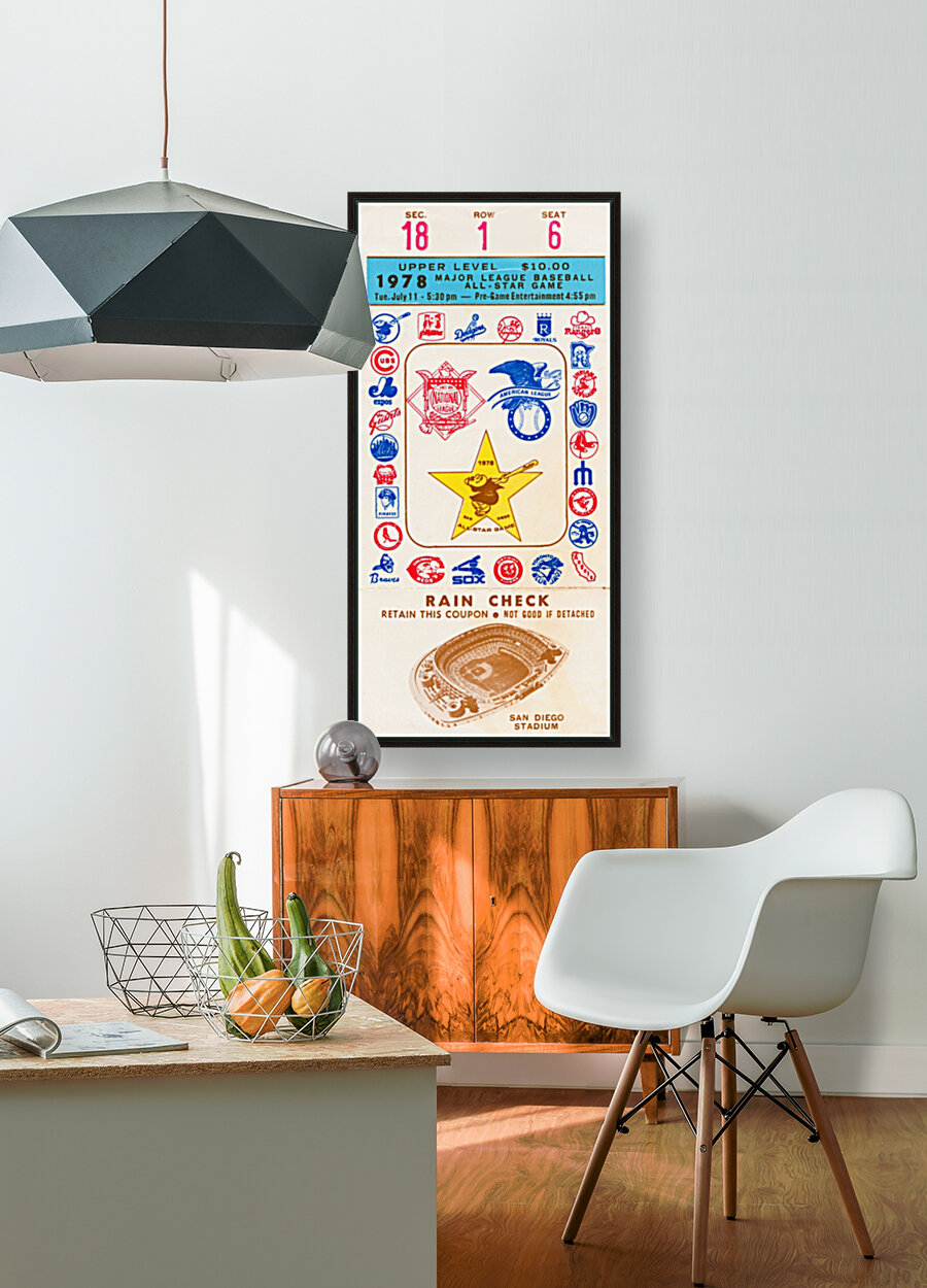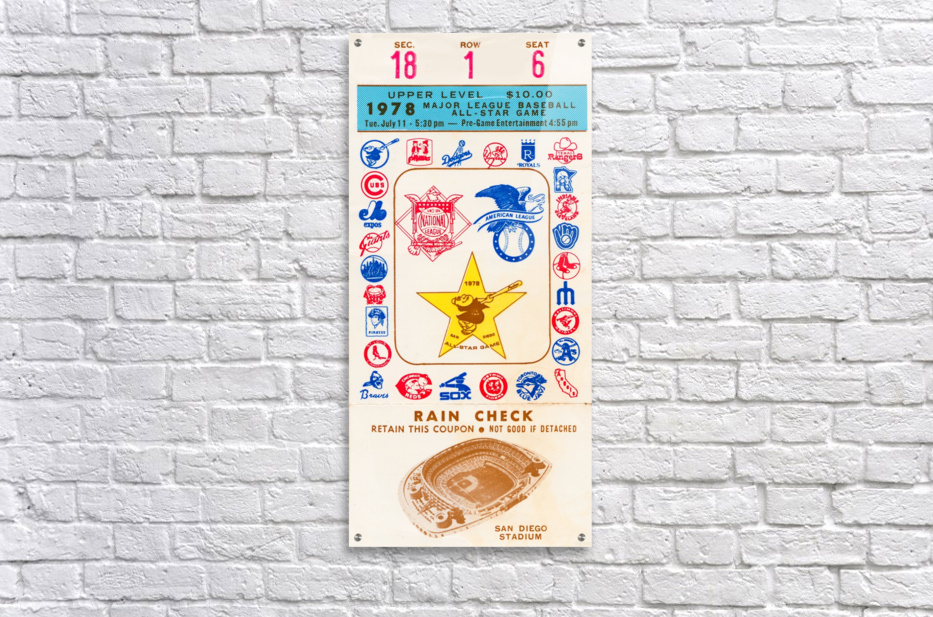 The National League won 7-3 as Steve Garvey got MVP honors. This Row One Brand 1978 Baseball All-Star Game Ticket Stub Canvas will look great in your San Diego game room or office. Row One Brand historic baseball ticket canvas art is not affiliated with, licensed, sponsored, authorized, or endorsed by any team, league, artist, athlete, other brand, or licensing entity.