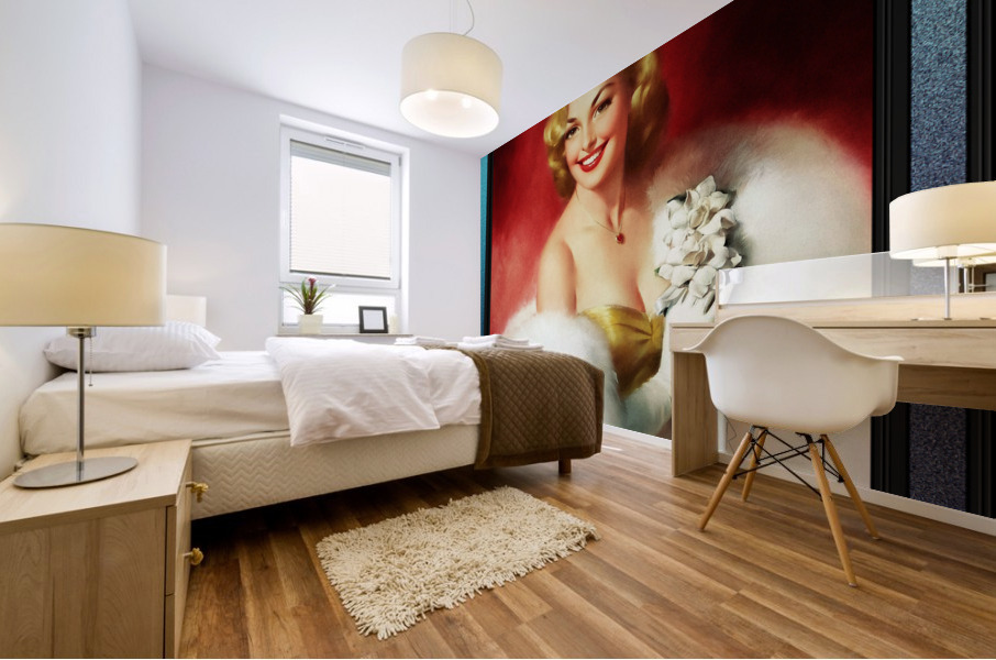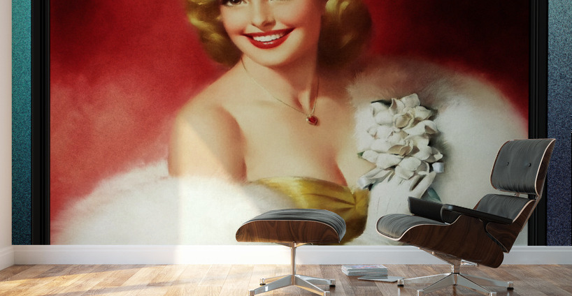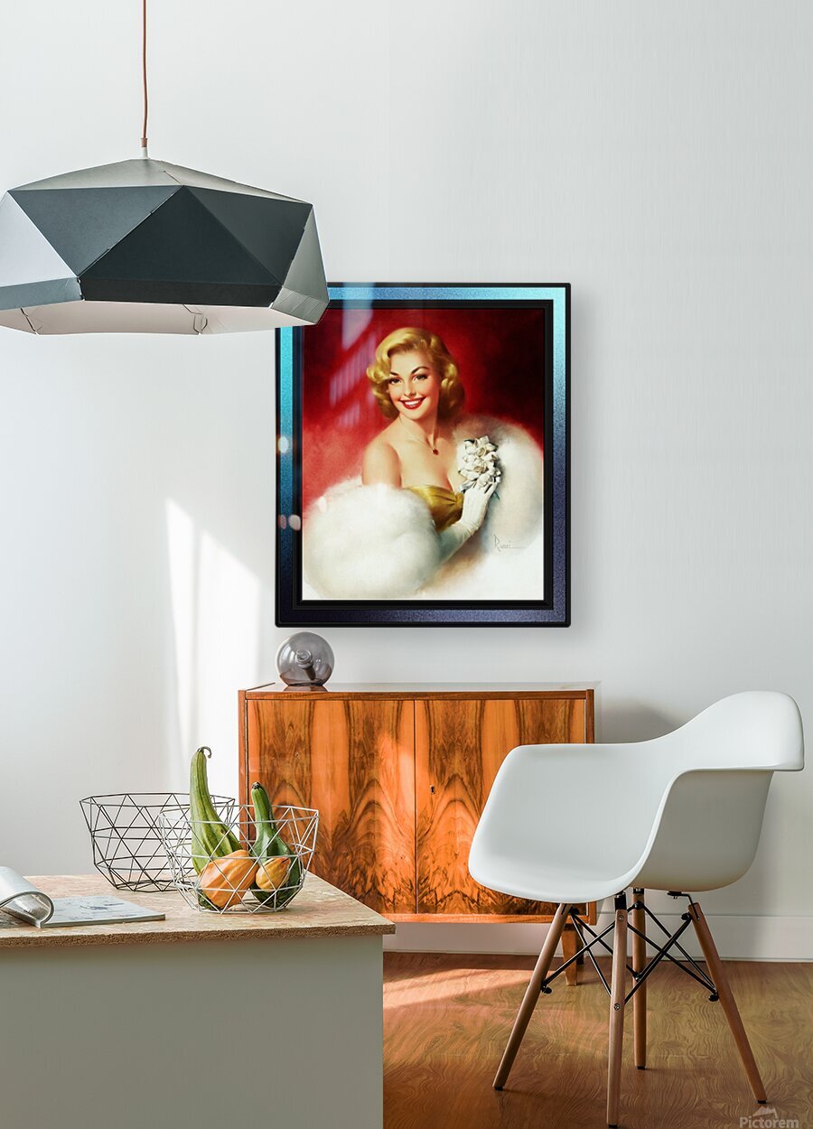 Golden Girl by Italian Born American Artist Edward Runci (1921 - 1986); Painter, Illustration, Portratist, Advertising and Pinup Artist. This painting of a young lady, is a gorgeous and elegantly beautiful sophisticated pin-up girl portrait of a golden hair blonde in a golden colored off shoulder evening dress, wearing a gold heart shaped ruby pendant around her neck. She is wrapped in a very large white fur coat or shawl that is off of her right shoulder with her right hand fitted in a white, arms length evening glove holding a white corsage in her right hand next to the left side of her chest. This is a retouched digital art old masters reproduction of a public domain image.