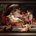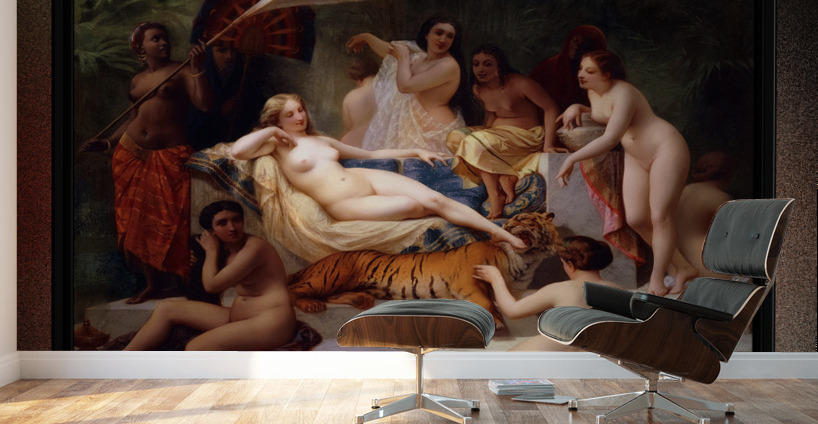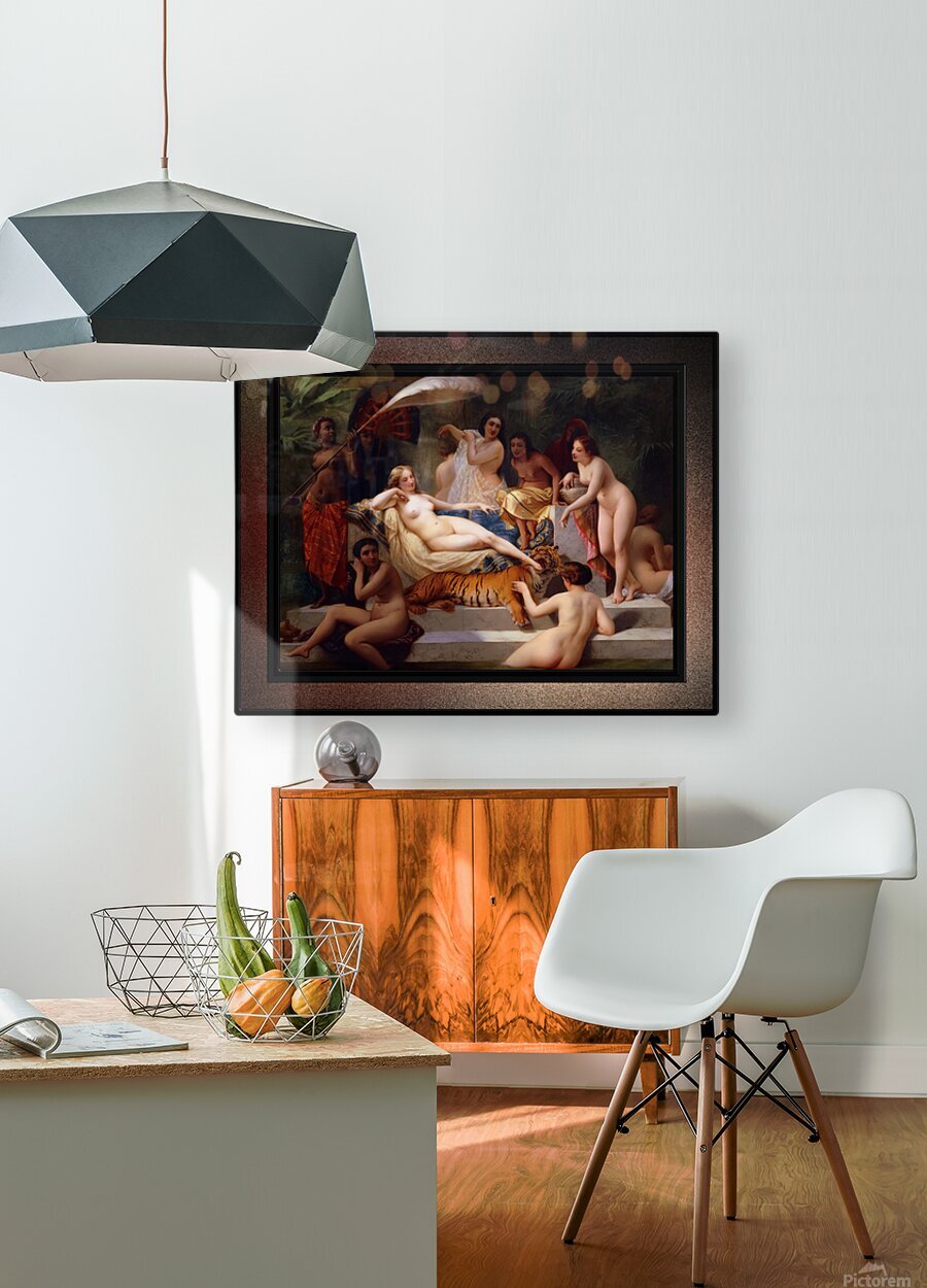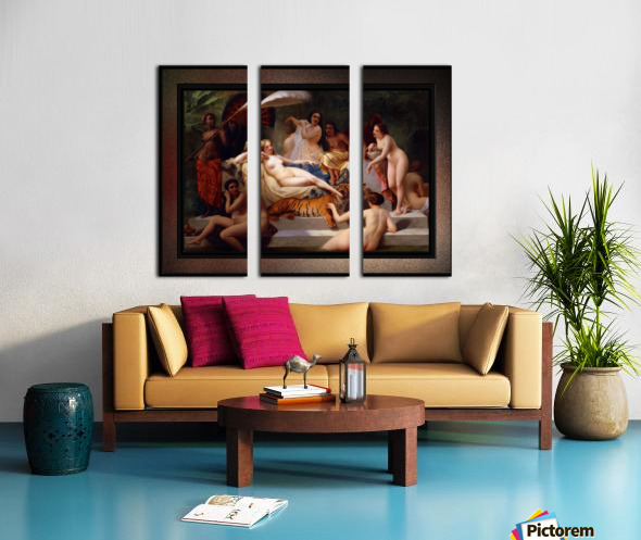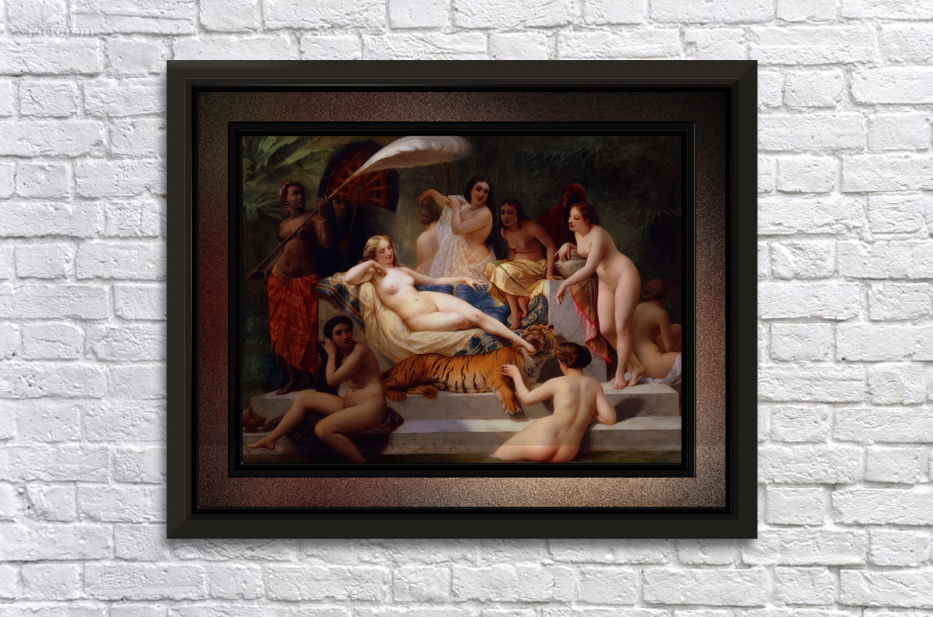 Odalisque c1858 by French Painter Henri-Pierre Picou (1824 - 1895); known for his early portrait work and historical subject matter and in his later years for his Allegorical and Mythological themes An Odalisque was a female attendant or chambermaid in a Turkish Seraglio (a sequestered living quarter used by wives and concubines in an Ottoman household.). This Odalisque painting shows a nude central female figure who may be the main wife or Concubine, is resting on a marble couch that is padded with decorative pillows and sheets; that is part of a double stacked marble base that leads to a pool; and in the background there are green plants. She is surrounded by eight other nude women; two that are partially in the pool of water. with one petting a young tiger that is putting the foot of the main female into its mouth. There are also three more females, that one can assume are slaves that are providing for the needs of the other women that are relaxing on the marble pedestal. This is a retouched digital art old masters reproduction of a public domain image.
