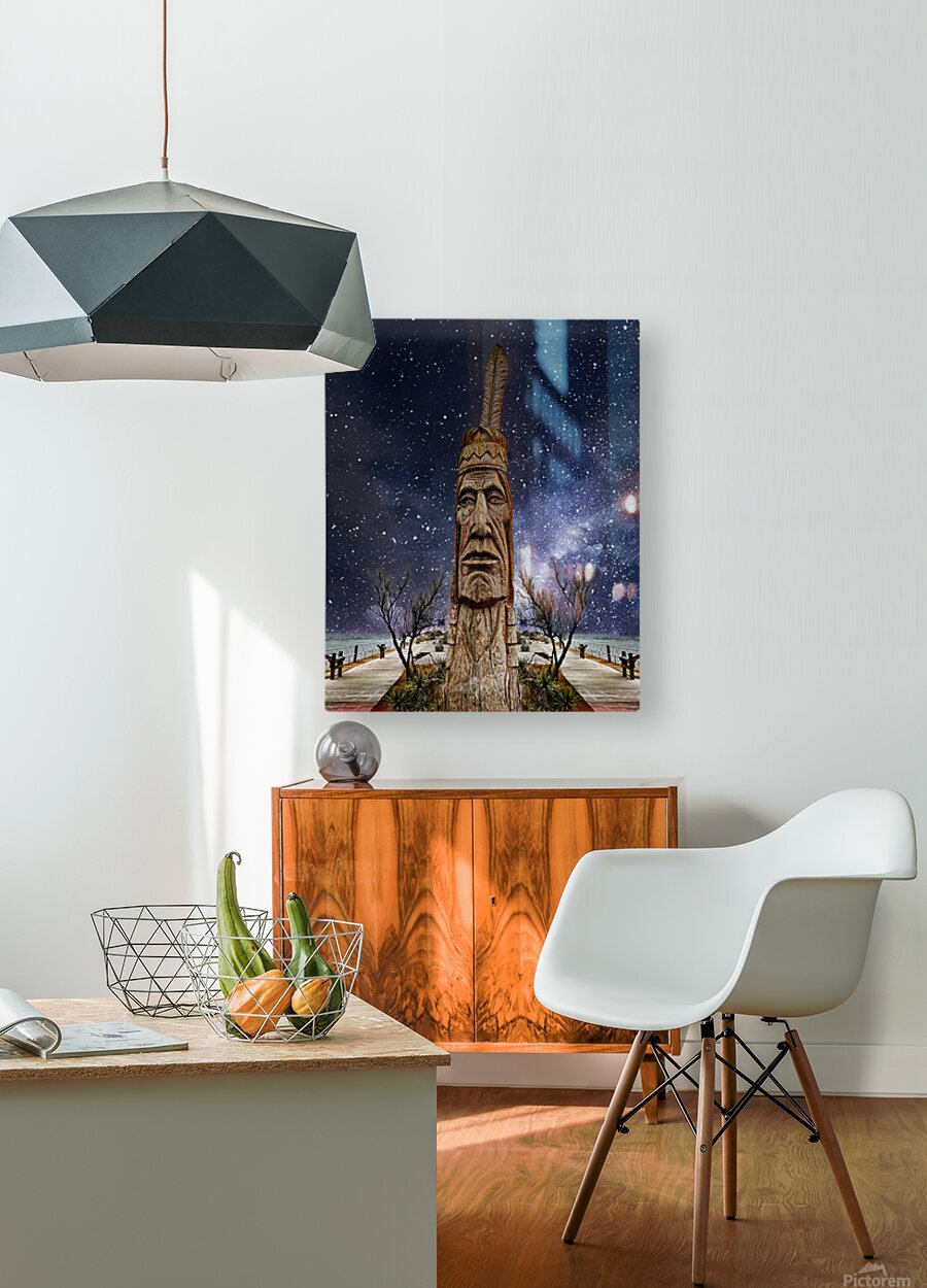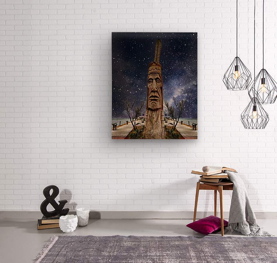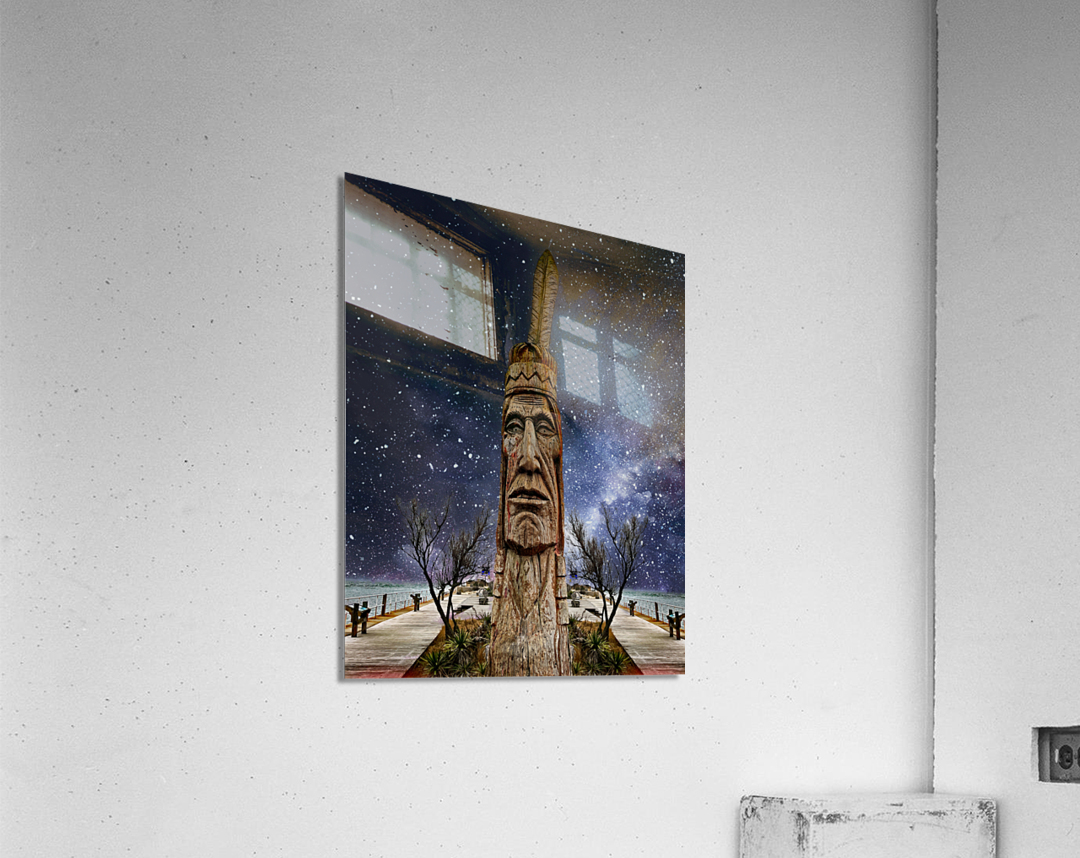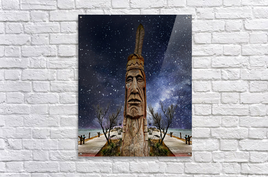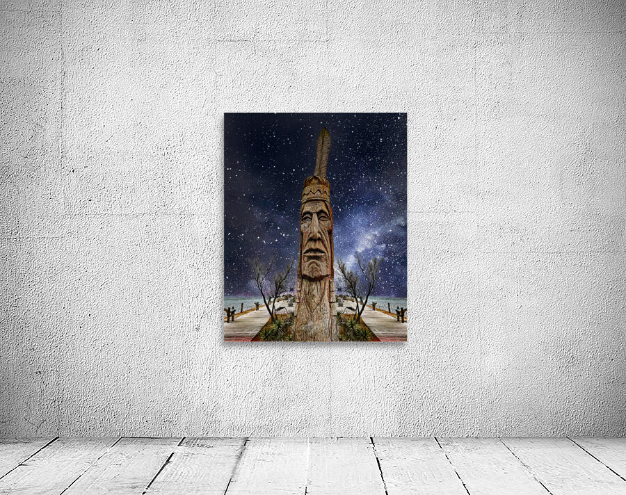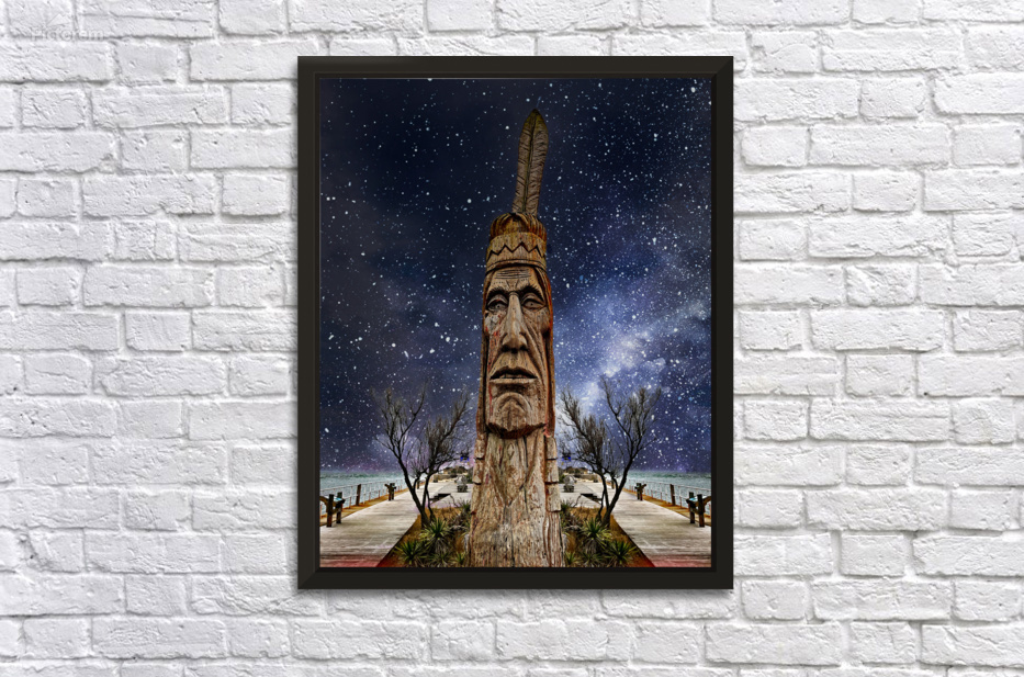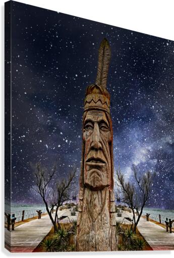 This iconic Indian Totem Pole monument, edited here to remove buildings and to add a "night sky" astronomical background, stands at the entrance to the Inlet Parking Lot in Ocean City, Maryland. The following narrative is from the educational plaque at the base of the monument... TRAIL OF THE WHISPERING GIANTS MARYLAND'S INDIAN This monument, represeting the Assateague Indian, was sculptured by Peter Toth and given to the people of Maryland as a gift. Toth is presently sculpturing an Indian monument in each of the fifty states, to pay homage to his heritage and to raise the nation's consciousness as to the plight of the Native Americans. The monument carved from 100 year old oak was completed in 1976. The Assateague Indian was a sub-tribe of the Nanticoke; both spoke a dialect of the Lenapes or Delaware Indian, which made them members of the Algonkian family. Indian groups living in the vicinity of Assateague Island included the Pokomoke, Annamessex, Manokin, Nassawattex, Acquintica, Assateague, Chincoteague and Kicotanks. By the early 1700's the Assateague, along with all the other Indian tribes in the area, were pressured by colonists to move northward out of the region. Their migration led them through Delaware, Pennsylvania, New York and finally into Canada where they were lost to history.