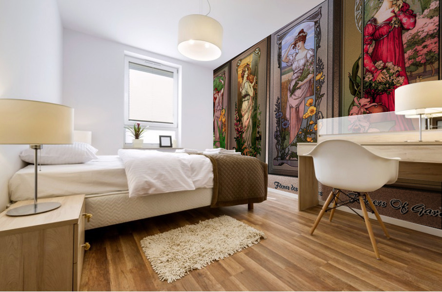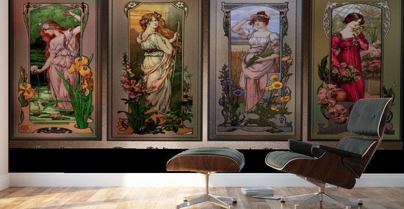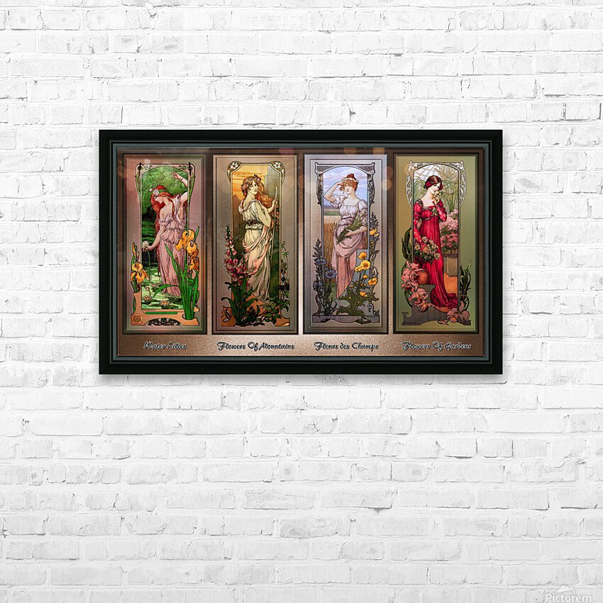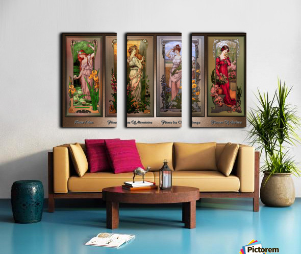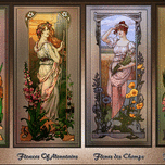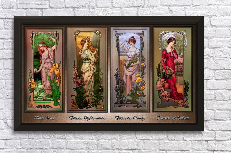 Art Nouveau Flower Series c1900 by French Painter Élisabeth Sonrel (1874 - 1953); and illustrator of the Art Nouveau style; who's works included allegorical subjects, mysticism and symbolism, portraits and landscapes. This is a collection of four of Élisabeth Sonrel Art Nouveau Flower Series paintings; which include Water Lilies, Flowers of Mountains, Fleurs des Champs, and Flowers of Gardens. Each painting depicts an attractive young lady or flower maiden among a large amount of flowers appreciating they're beauty. This is a retouched digital art old masters reproduction of a public domain image.