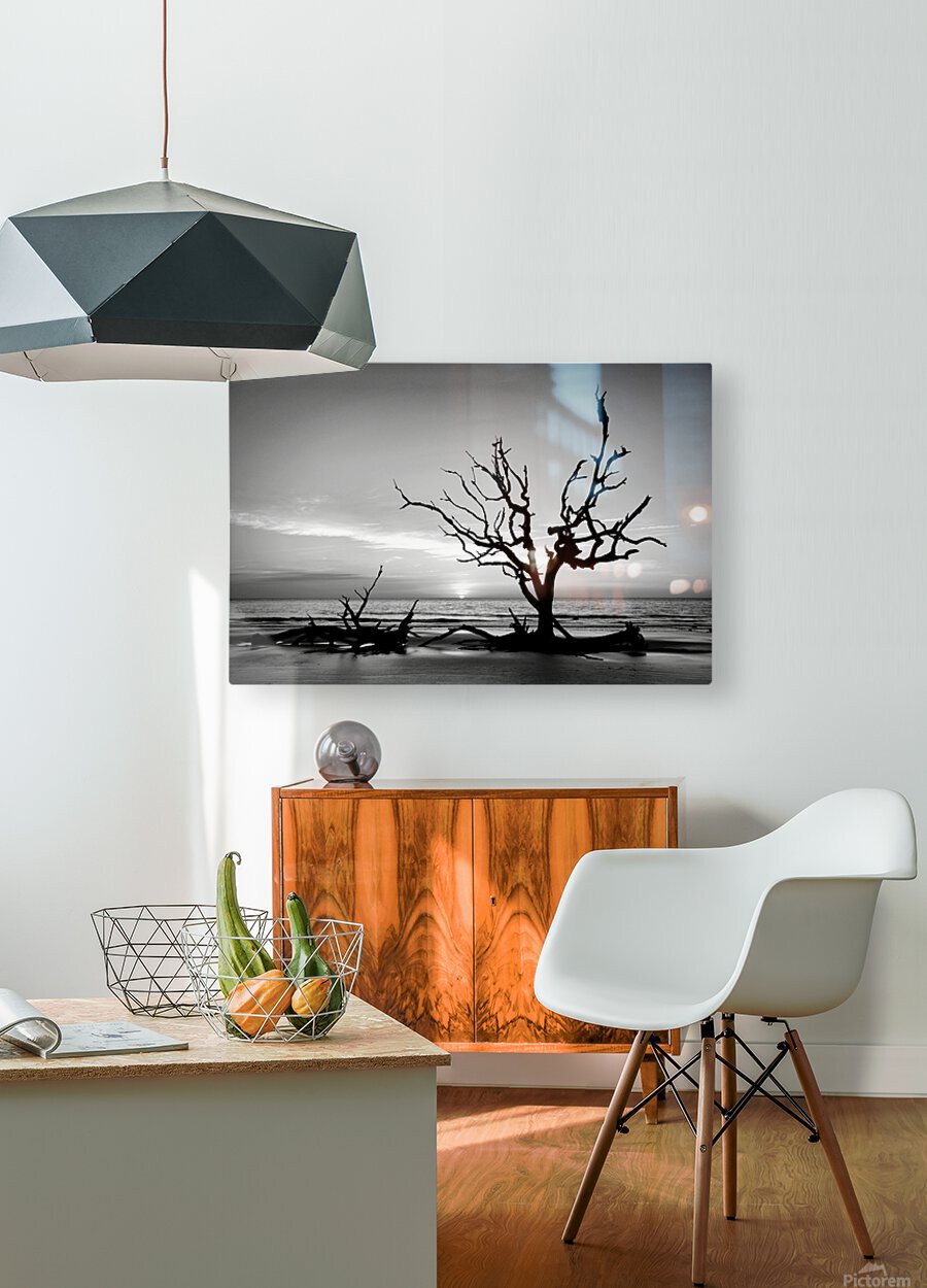 Even a sunrise can be beautiful in black and white. A solitary driftwood tree stands tall to greet the sunrise on Driftwood Beach in Jekyll Island, Georgia. Driftwood Beach is on the northern end of Jekyll Island, one of Georgia's Golden Isles, and is a picturesque place featuring numerous driftwood trees and parts of trees. This "scene from another world" was created by years of erosion that caused trees of a marine forest to topple into the salt water of the Atlantic ocean and die. While it is a form of marine debris, or tidewrack, is can also be quite beautiful and even mysterious. The salinity of the ocean water tends to preserve the trees for many decades - if not longer.