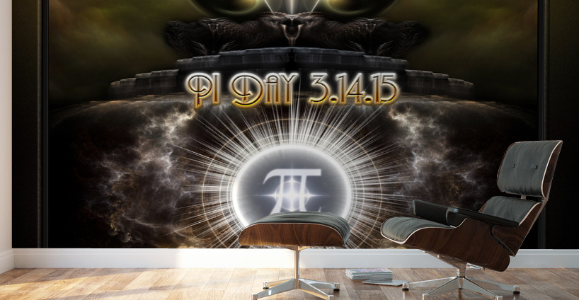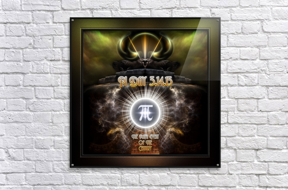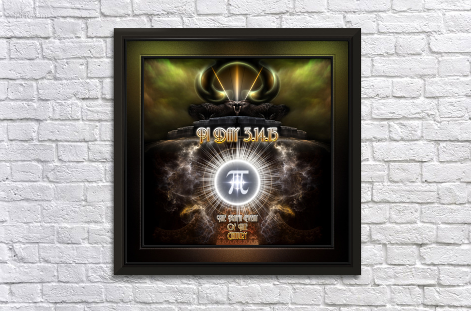 This Gothic fractal composition celebrates "The Math Event Of The Century" Pi Day 3.14.15. The Pi Day 3 14 15 fractal scene is composed of multiple pedestal like structures starting at the bottom with what looks like an intricate piece of carved stone. that rises into multiple cloud layers. As the clouds rise we come upon the first wide layer of stone on which another chiseled grey stone layer rest and on top of that a winged stoned layer on which rays of golden light are emitted and two large circular loops encompass an orb. On the front of the piece is Pi Day 3.14.15 close to the top of the grey stone, below that are three disc, one imposed on top of the other with a star burst in between the disc layers and the Pi symbol on the front. On the bottom is the quote "The Math Event Of The Century". This Pi Day 3 14 15 scene was created using the Fractron 9000 Fractal Generator and the Photo Elements 7 image editor.