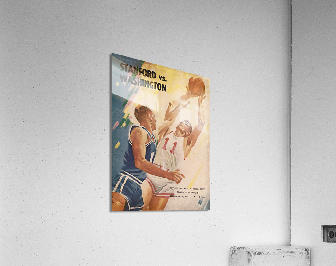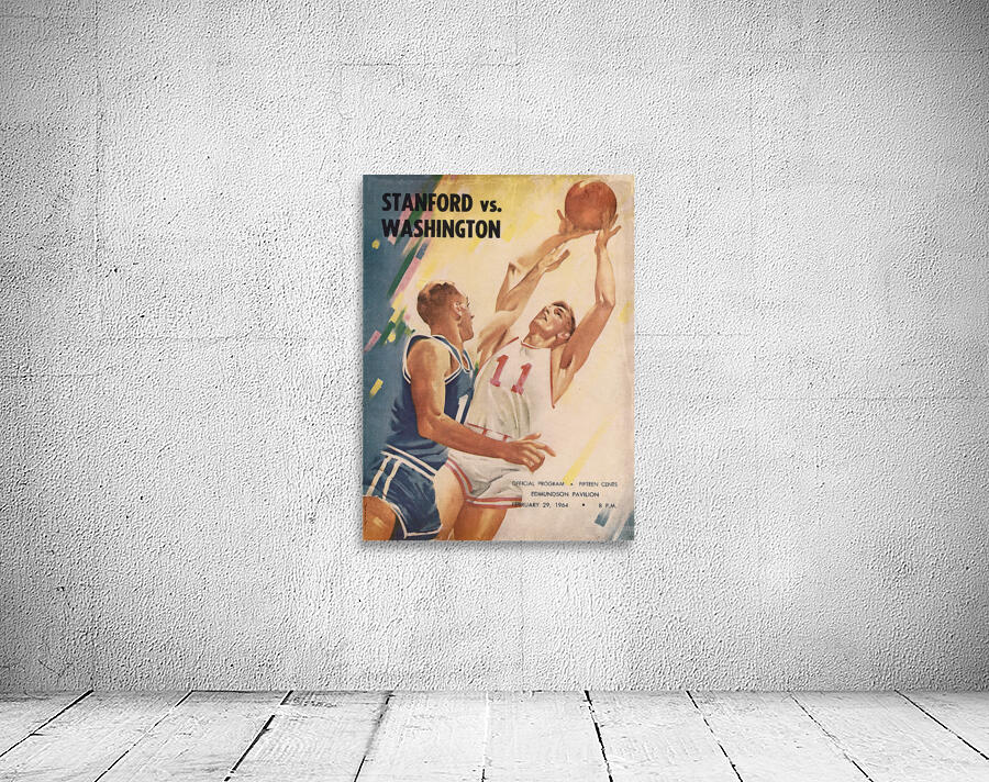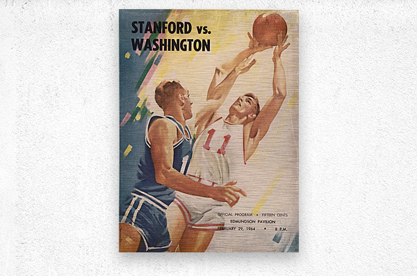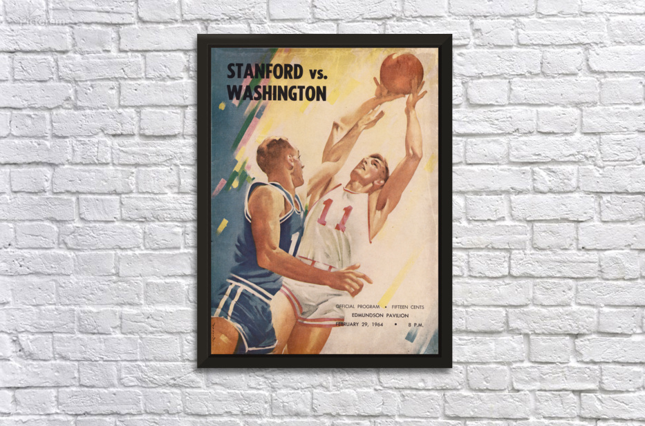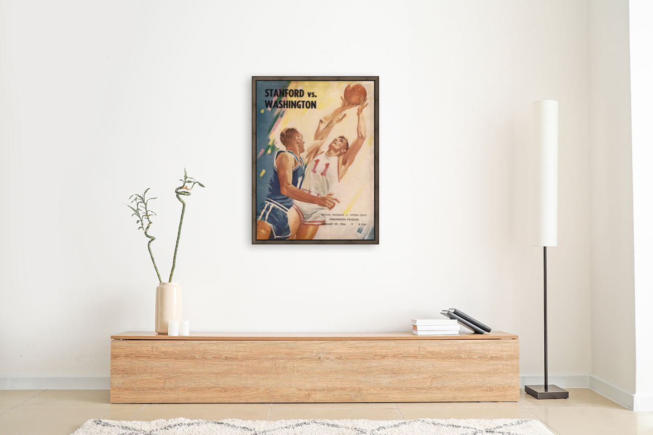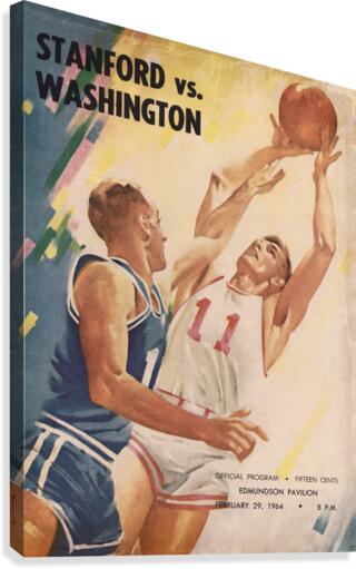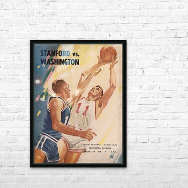 Artist Lon Keller | Row 1 | 1964 Washington vs. Stanford Basketball Cover Art | Row One Brand | Free Shipping | If you love Washington basketball, you will love this vintage 1964 University of Washington Huskies basketball cover art by legendary sports artist Lon Keller. This vintage Washington basketball art will look great in your Seattle game room or office. Row One Brand historic college sports art prints are not affiliated with, licensed, sponsored, authorized, or endorsed by any college, university, team, league, artist, athlete, venue, other brand, or any licensing entity. Only non-copyright, historic sports programs are used by Row One to create our vintage program cover sports art prints. Derivative art © 2021 Row One Brand
