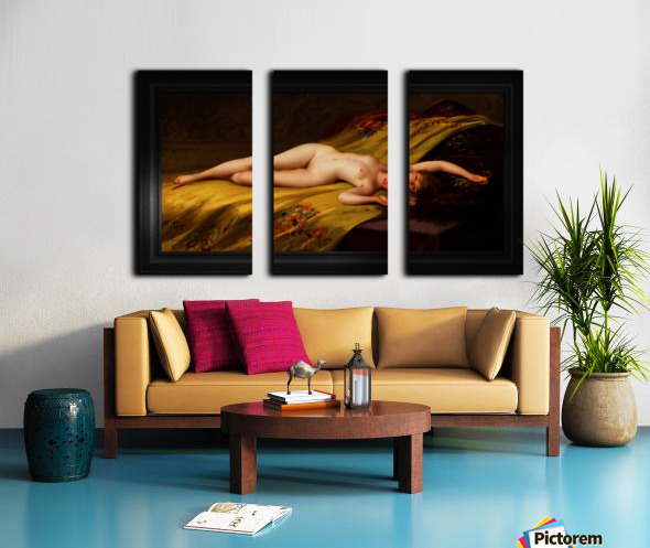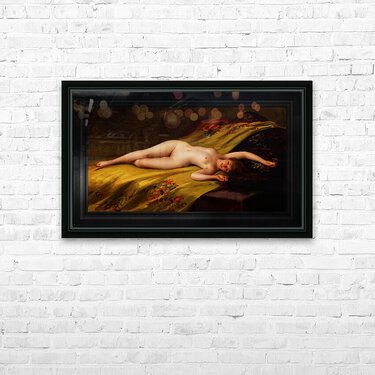Reclining Nude c1879 by Spanish Painter Luis Ricardo Falero (1851 - 1896); and Duke of Labranzano was an oil on canvas painter that specialized in female nude portraits, mythological, oriental and fantasy themed artwork; and with an interest in astronomy incorporated celestial constellations in many of his artistic creations. This is a splendid an alluring portrait of a beautiful young lady stretching out nude across her very large bed lying on golden yellow sheet that is embroidered with floral accents on either end, with her right hand resting a very large deep wine red gold embroidered pillow. This is a retouched digital art old masters reproduction of a public domain image.