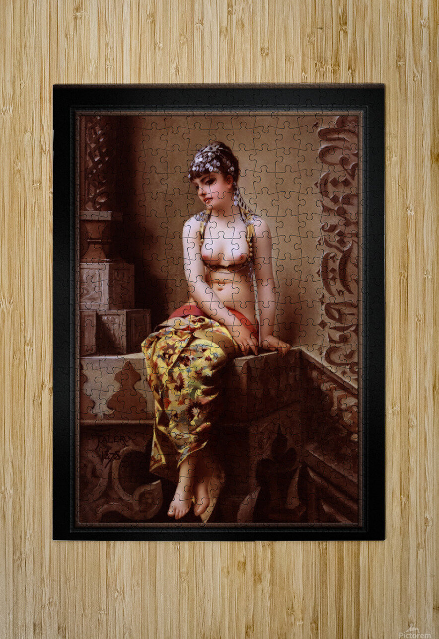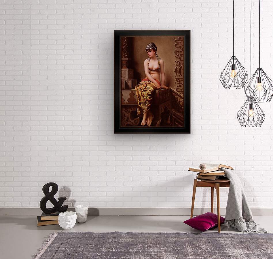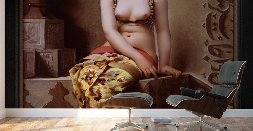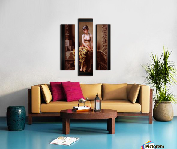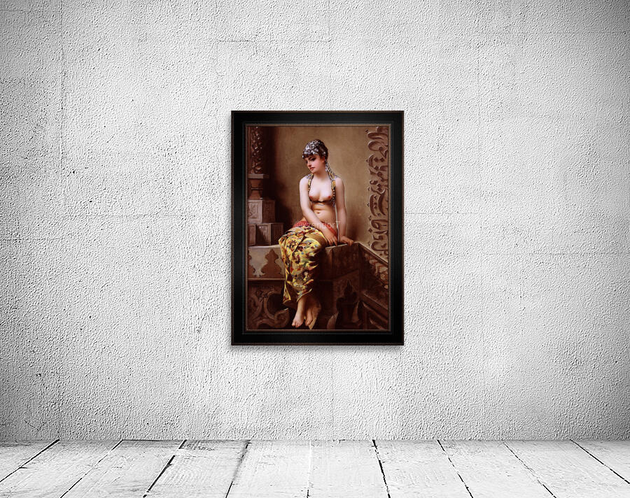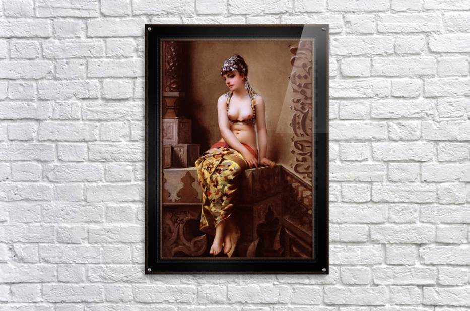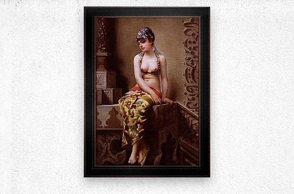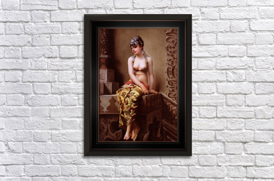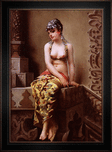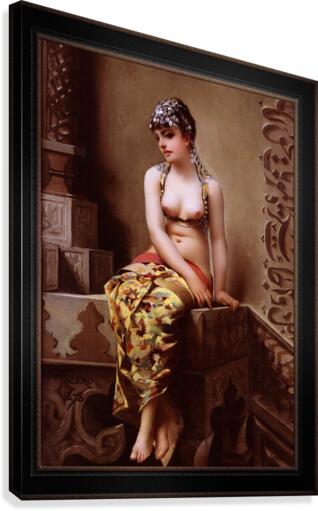 Enchantress c1878 by Spanish Painter Luis Ricardo Falero (1851 - 1896); specialized in female nudes with an emphasis on mythological, oriental and fantasy themes, which he skillfully combined with his interest in Astronomy, incorporating celestial constellations into many of his artistic creations. This is an oriental style portrait of a beautiful young lady in a sitting pose on a ledge with a yellow flower patterned cloth wrap around her waist, a shoulder wrapped type vest that goes under her exposed breast and around the back of her neck made of a gold material and brown leather accented with gold balls and silver trinkets that complement the silver trinket head dress she is wearing. This is a retouched digital art old masters reproduction of a public domain image.