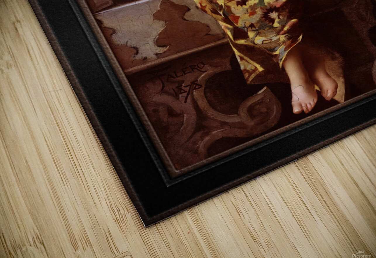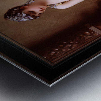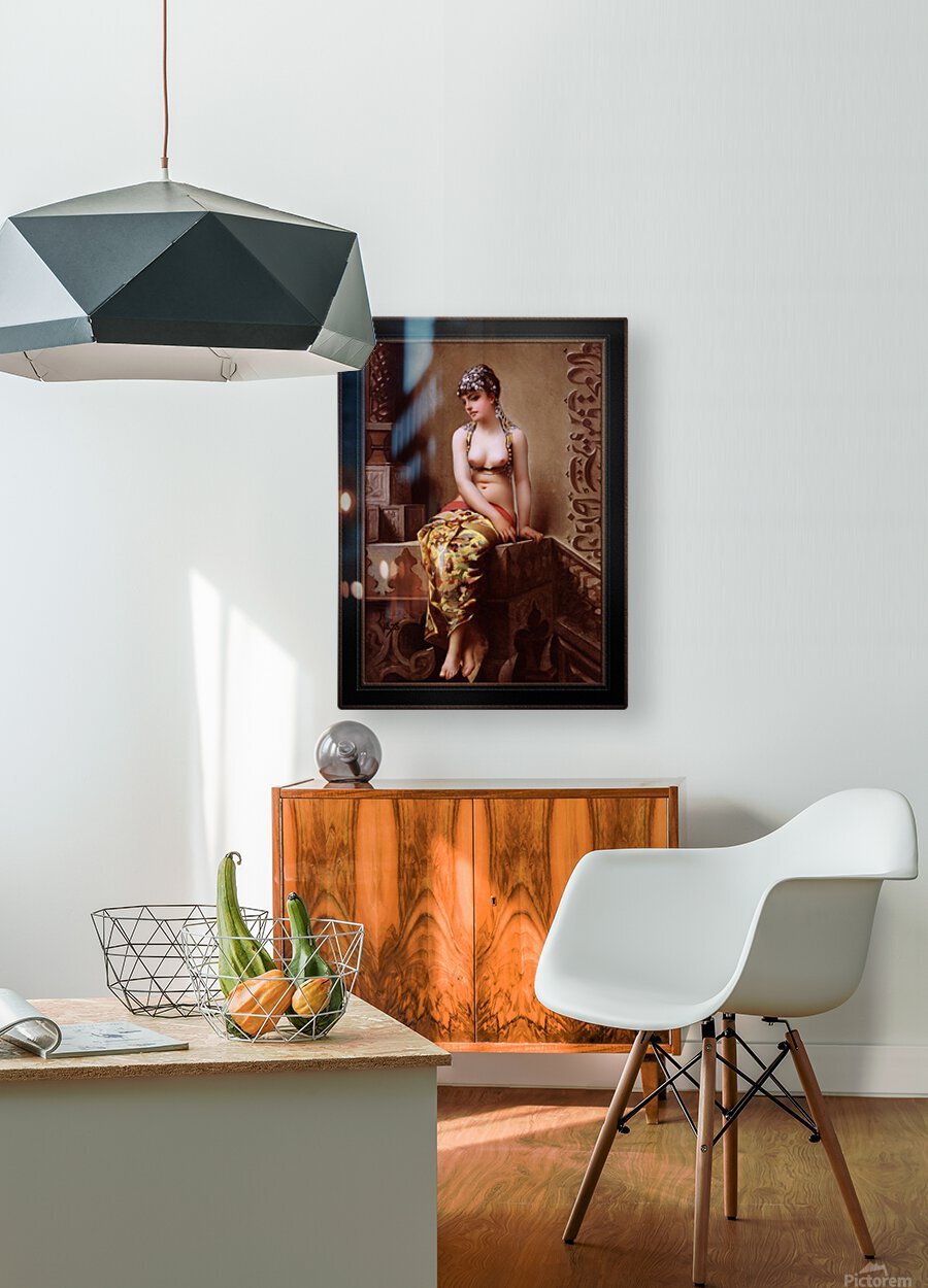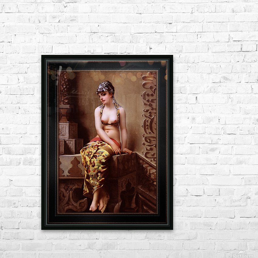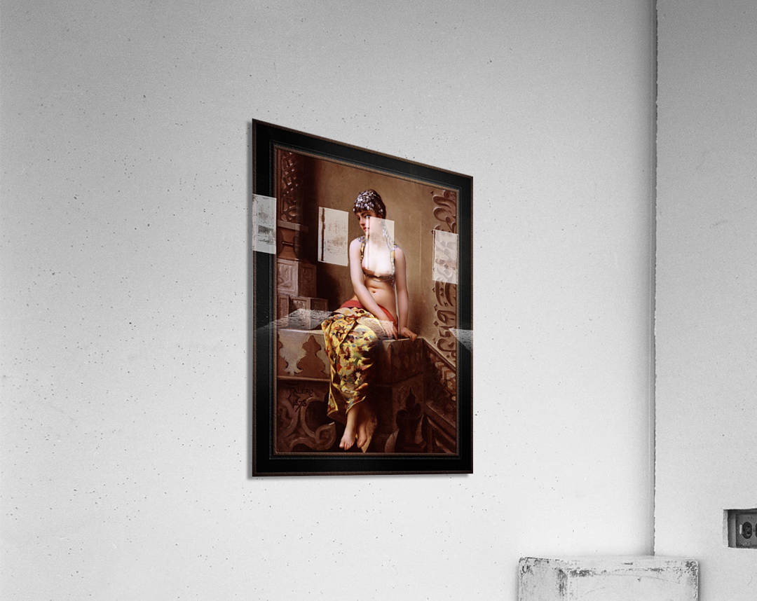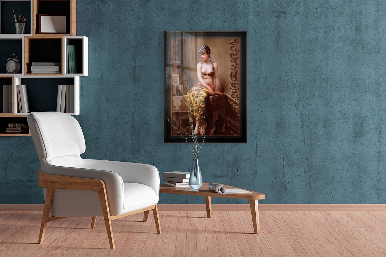Enchantress c1878 by Spanish Painter Luis Ricardo Falero (1851 - 1896); specialized in female nudes with an emphasis on mythological, oriental and fantasy themes, which he skillfully combined with his interest in Astronomy, incorporating celestial constellations into many of his artistic creations. This is an oriental style portrait of a beautiful young lady in a sitting pose on a ledge with a yellow flower patterned cloth wrap around her waist, a shoulder wrapped type vest that goes under her exposed breast and around the back of her neck made of a gold material and brown leather accented with gold balls and silver trinkets that complement the silver trinket head dress she is wearing. This is a retouched digital art old masters reproduction of a public domain image.