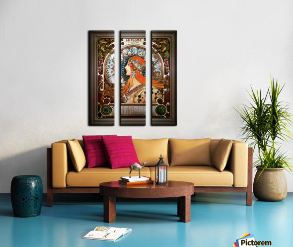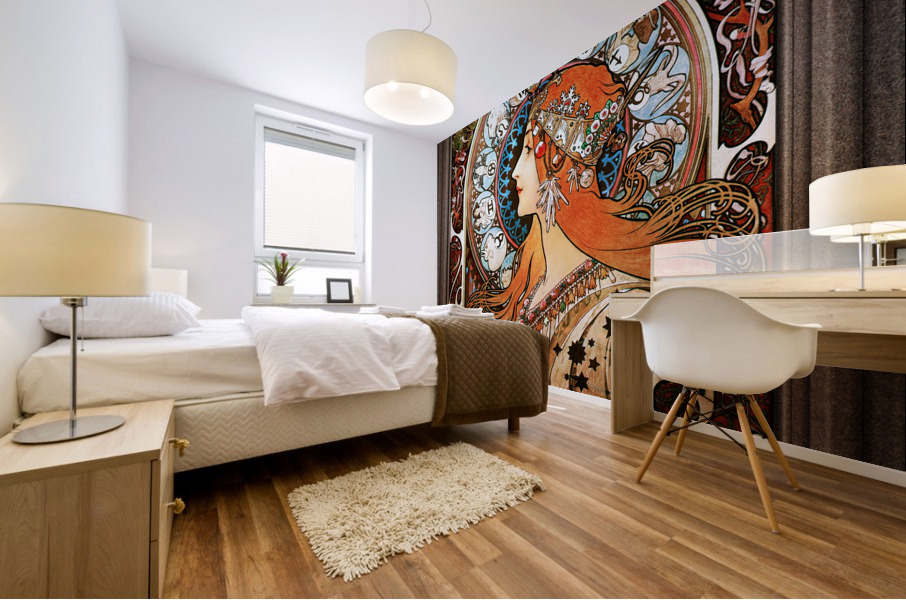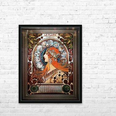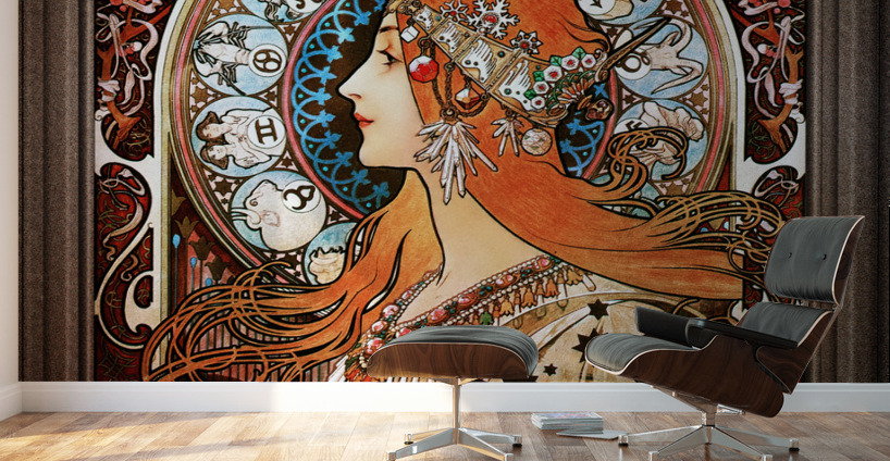 Zodiac 1897 Calendar by Czech Painter Alphonse Mucha (Alfons Maria Mucha: 1860 - 1939) one of the most popular and well known artist of the Art Nouveau Period. Zodiac c1896 is an outstanding example of Mucha's Art Nouveau Mastery. It was the first piece of artwork he created for the print company Champenois, and it incorporates twelve zodiac symbols situated as a halo disk behind a side profile of a young lady's head. It is beautifully adorned with various patterns and a complex floral arrangement made up of plants, flowers and vines, which are placed along the perimeter of the image; while the young lady with her flowing orange hair has her head adorned with a jeweled headdress of gold and ivory pieces; with a globe above her forehead and pendants hang on the side of her face; accented with a large jeweled and ivory necklace. This piece gained the notice of Léon Deschamps, who at the time was the chief editor of La Plume Magazine and he purchased the rights to distribute the artwork as the magazine's calendar of 1897. This was one of Mucha's most popular designs, with at least 9 variants being made including the base image that contains no text which was created in 1896. At the top is the inscription LA PLUME - Revue Bi-Medsuell Illustree Ab 12:00 15 par An Le 60 ccop - 31, Rue Bonaparte, Paris - Salon des Cent_Bibliotheque Artistiqu et Litteraire This is a retouched digital art old masters reproduction of a public domain image.