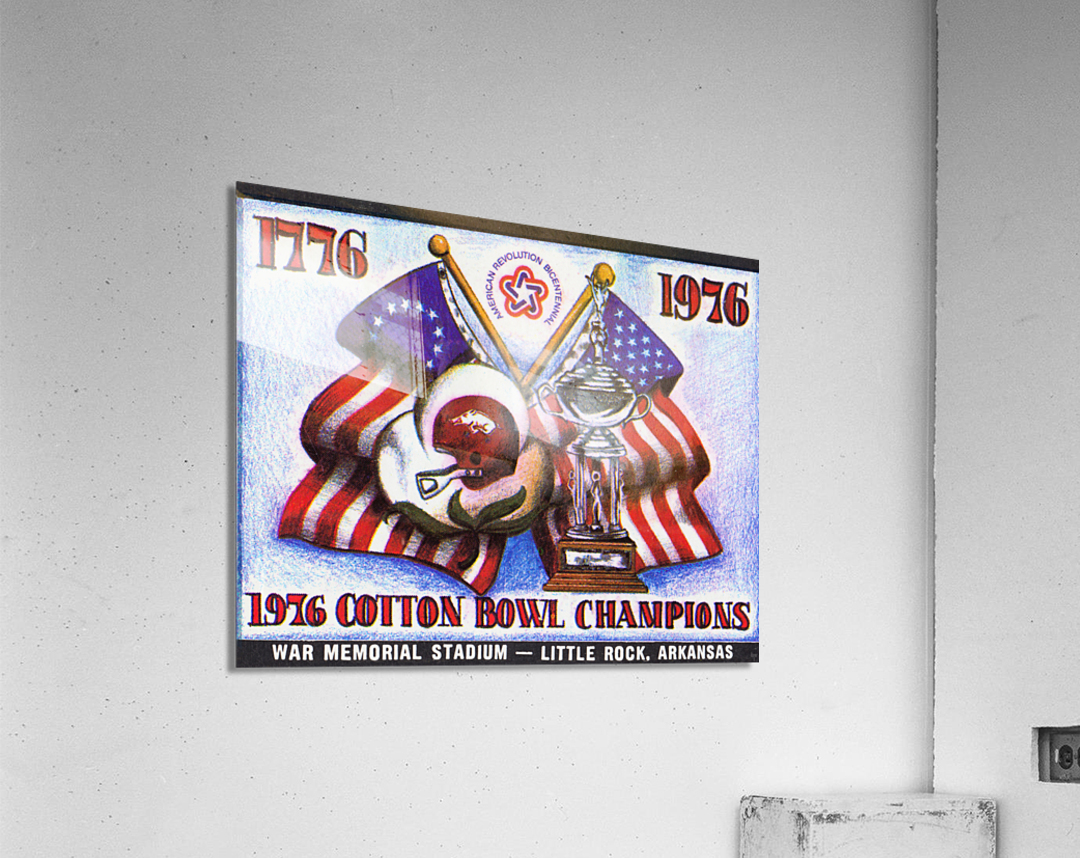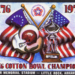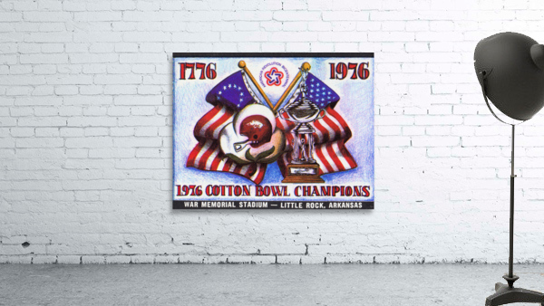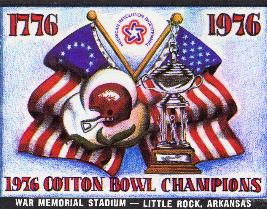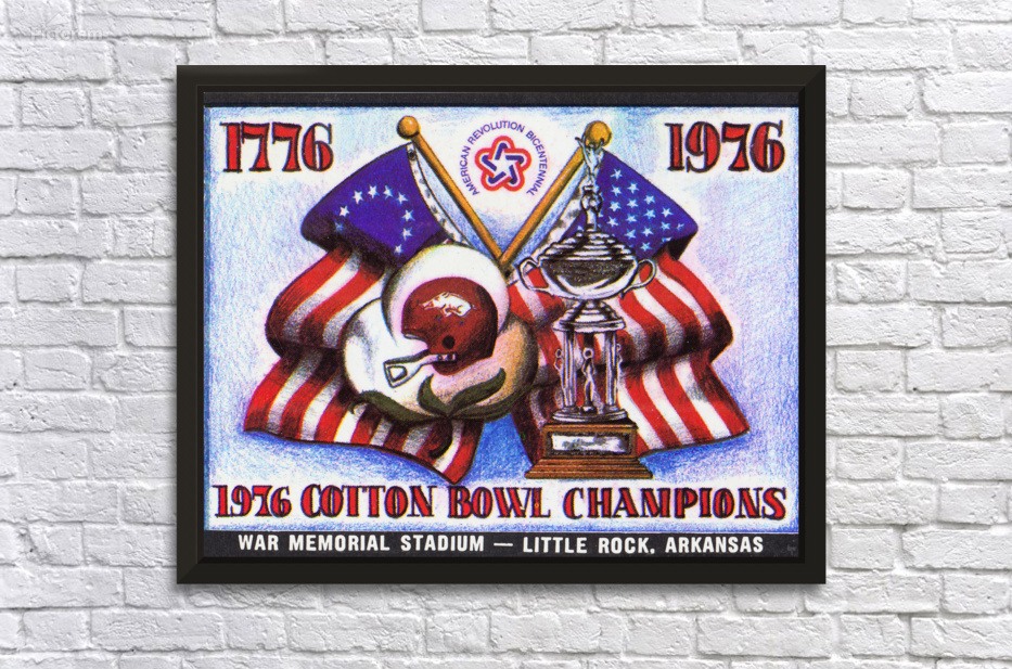 Frank Broyles' squad went 10-2 in 1975 and won the 1976 Cotton Bowl over Georgia. This 1976 Arkansas football ticket stub design celebrates that feat as well as the '76 American Bicentennial. Digitally restored for vivid color, this Row One Brand vintage Arkansas football ticket art will look fantastic in your game room or office. Row One Brand's historic college football ticket stub art prints are not affiliated with, licensed, sponsored, authorized, or endorsed by any college, university, team, league, artist, other brand, or any licensing entity. Only non-copyrighted, public domain memorabilia dating back to 1876 is used by Row One to create our historic sports prints. Derivative art © 2021 Row One Brand