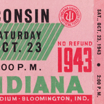 The Hoosiers beat the Badgers 34-0 in this college football game played in Bloomington, Indiana on October 23, 1943. Digitally restored for vivid color, this Row One Brand vintage Indiana football ticket art will look fantastic in your home or office. Row One Brand's historic college football ticket art prints are not affiliated with, licensed, sponsored, authorized, or endorsed by any college, university, team, league, artist, other brand, or any licensing entity. Only non-copyrighted, public domain memorabilia dating back to 1876 is used by Row One to create our historic sports prints. Derivative art © 2021 Row One Brand