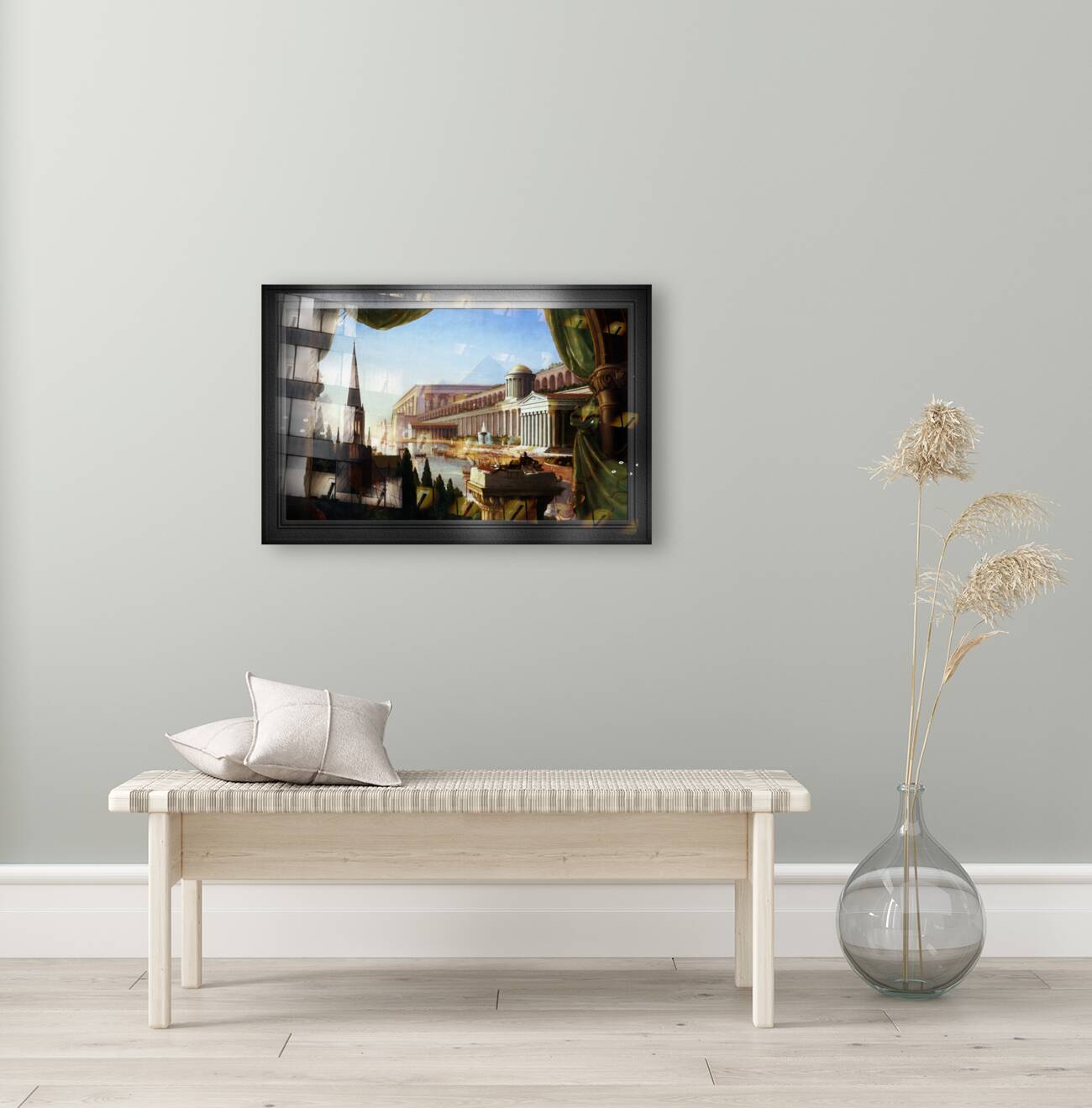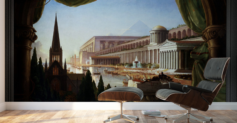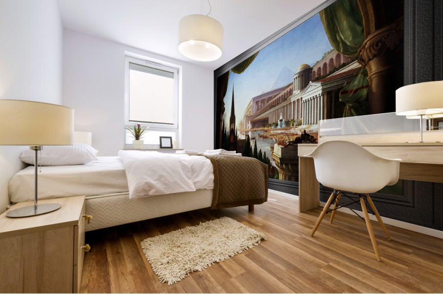 Architects Dream c1840 by American Artist Thomas Cole (1801 - 1848); specializing in historical and landscape paintings that portrayed the American wilderness and was part of the Hudson River School Movement. This is a beautiful eye catching image of an architect reclining amongst large books on a stone block that sits aloft a beautifully sculpted column; and our perspective of this is a view through a large window with columns adorned in lime green red pattern drapes. He is daydreaming of the accomplishments of mans architectural achievements, from the days of the glorious empires of the Egyptians and the Romans to that of the beautiful European Cathedrals the current modern times of the 1800s in which he lives. In the image we see a large waterway that opens in the ocean filled with ships and to the far right of the artwork, we can see several Egyptian temples with a massive Pyramid towering above them. Then the scene transitions to that of Roman architecture with a much smaller temple with columns, a building with a large dome and a large state building with sculpted accents; and above that an aqueduct that runs the entire length with a gardens. On the left of the image we then see the accomplishments of the modern era of the time which is represented by a large European Cathedral, accented with many trees. This is a retouched digital art old masters reproduction of a public domain image.