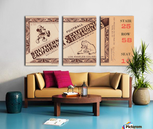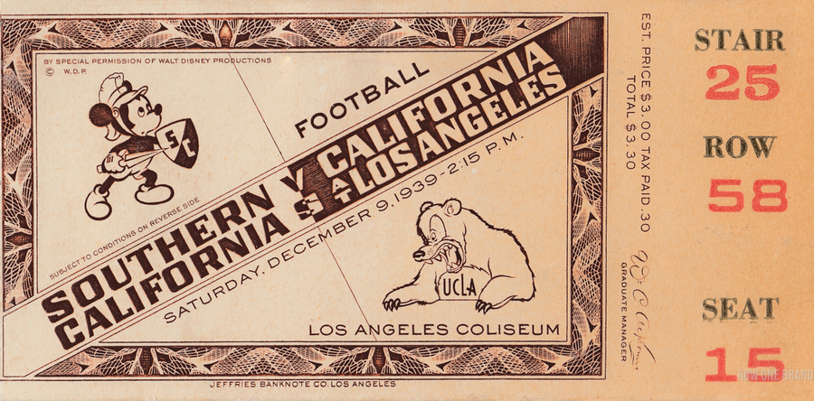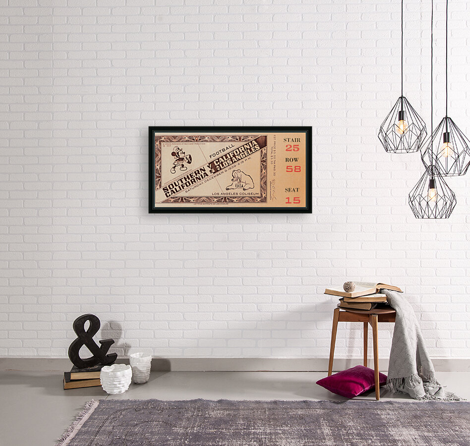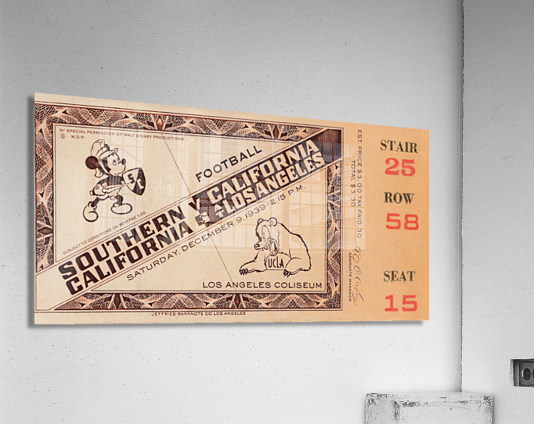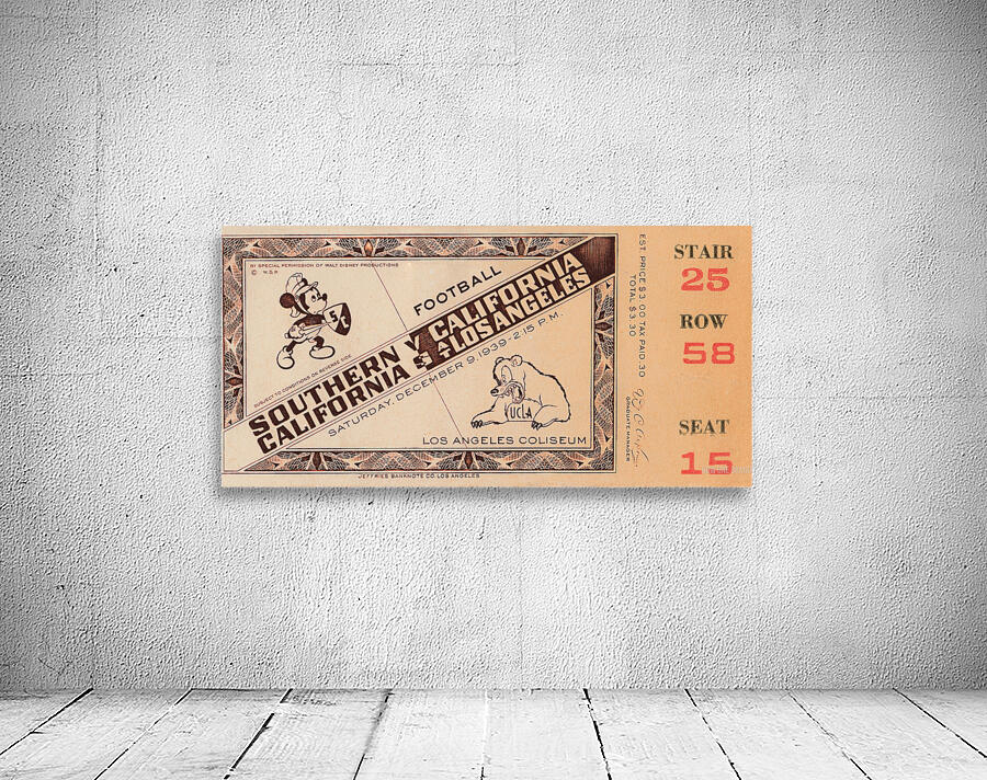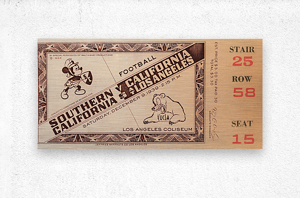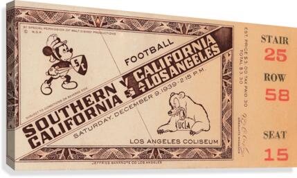 1939 USC Trojans vs. UCLA Bruins Ticket Stub Art | LA Coliseum | December 9 | Row 1 | #3 USC and #9 UCLA tied 0-0 at the Los Angeles Coliseum in a game played December 9,1939 in front of a crowd of 103, 303. The Trojans went 8-0-2 won the '39 National Title according to the Dickinson Selector. UCLA finished the season with six victories and four ties including three ties in their final four games. Row One Brand historic college football ticket wall art prints are not affiliated with, licensed, sponsored, authorized, or endorsed by any college, university, team, league, other artist, athlete, other brand, or any licensing entity. Only non-copyrighted and historic memorabilia with expired copyrights are used by Row 1 to create our historic sports art prints. Row One Brand | Shop 5,600 Historic Sports Prints | 1.5 Million Gallery Views | Row 1 | America's Best Vintage Sports Art Collection |