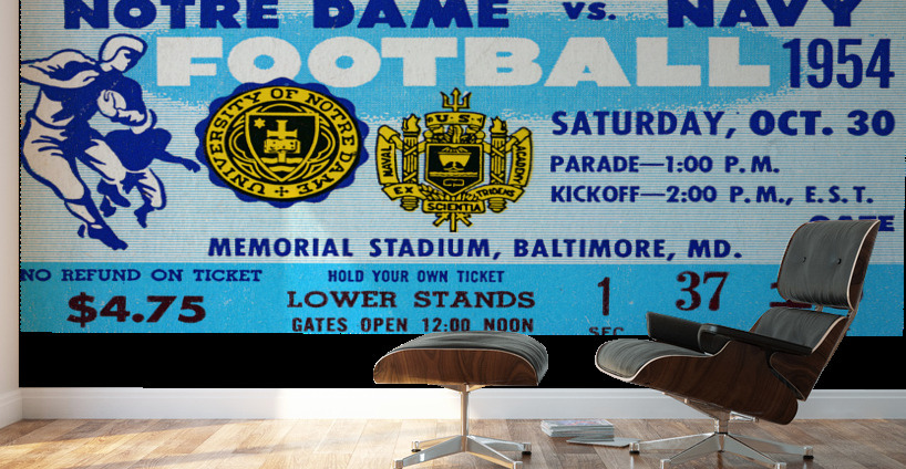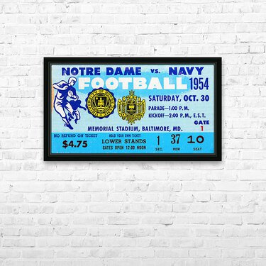 #6 Notre Dame beat #15 Navy 6-0 as Terry Brennan's Irish squad won their final eight games to finish #4 in the nation. Row One Brand's historic college football ticket stub wall art prints are not affiliated with, licensed, sponsored, authorized, or endorsed by any college, university, team, league, other artist, athlete, other brand, or any licensing entity. Only non-copyrighted ticket stubs dating back to 1893 are used by Row 1 to create our historic sports ticket art prints.