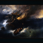 The Loss Of The Indiaman Kent by French Painter Jean Antoine Théodore Gudin (1802 - 1880); a marine painter and court painter to King Louis Philippe and then French Emperor Napoleon III. The East Indiaman Kent was owned by Stewart Marjoribanks and entered service with the East India Company in 1820. The Indiaman Kent was carrying about 700 people, mainly solders from the 31st regiment and their families, and it was commanded by Henry Cobb; and was on a voyage to Bengal, Bombay and China. The Loss Of The Indiaman Kent starts off in 1825, on February 19, the ship sailed from the Downs on a third voyage to Bengal and then China; during the 27th and 28th of February it encountered a storm, and on March 1, in the Bay of Biscay the ship accidentally caught fire. It was reported that there were individuals trying to steal liquor in her hold using a naked light (match, candle...) to see in the darkness that was responsible for the fire. Efforts were made to put out the fire by scuttling the lower ports to flood the hold, but due to the fear of the ship sinking the ports had to be shut. A sailor was sent aloft, presumably to the crows-nest; and reported another vessel in the vicinity. Thus a complex rescue effort was undertaken to ferry passengers and crew through the mountainous seas to the brig 'Cambrian', captained by Captain Cooke which was bound for Vera Cruz with its passengers of Cornish miners. Though the majority of the passengers made it off the ship; some though did not survive the two day / three night journey to Falmouth; most of the dead being children. Above information derived from Royal Museums Greenwhich https://collections.rmg.co.uk/collections/objects/13748.html