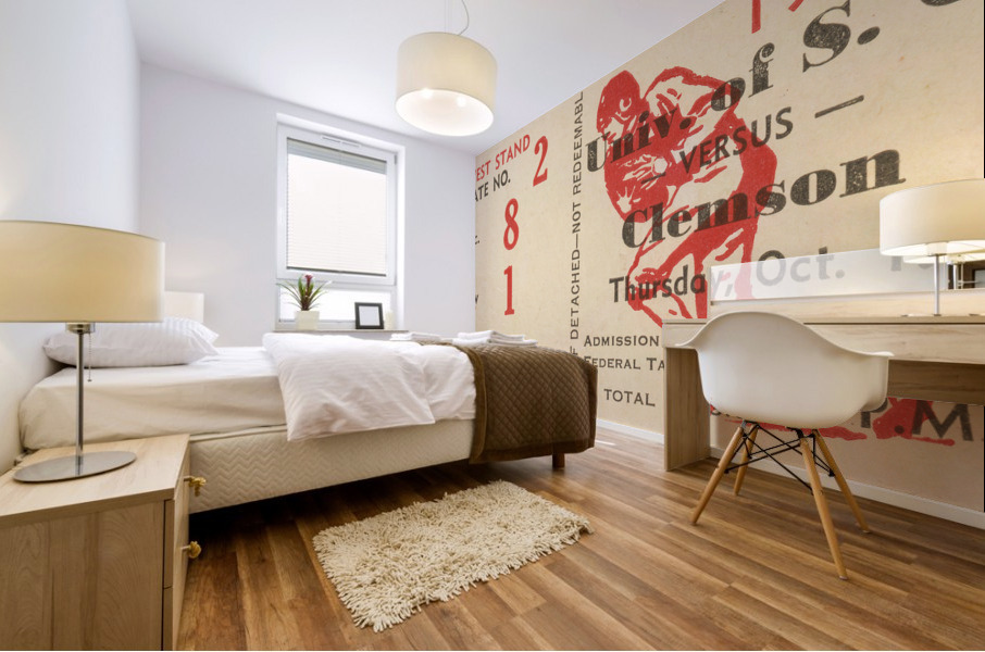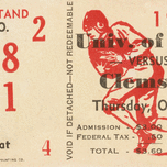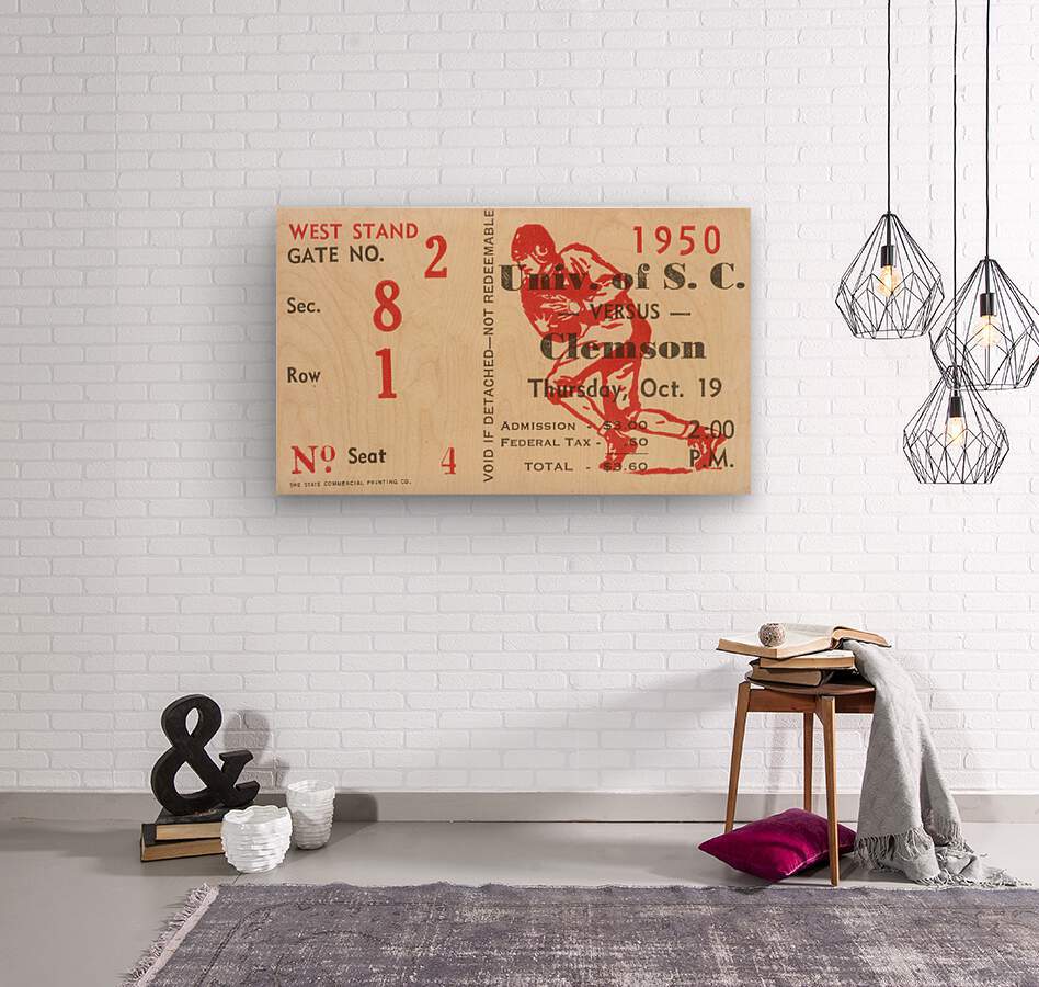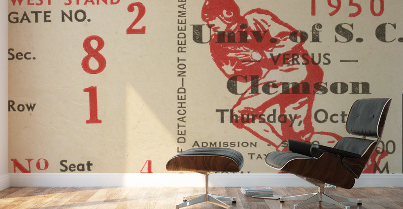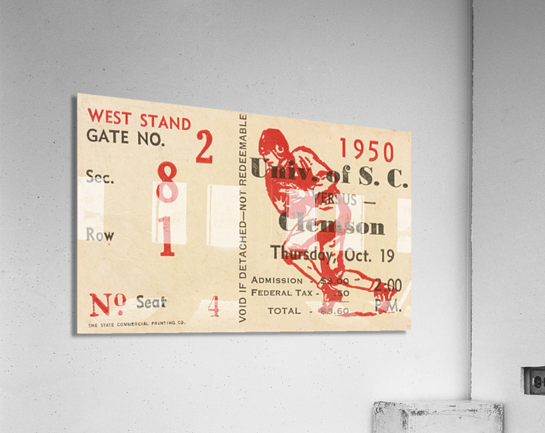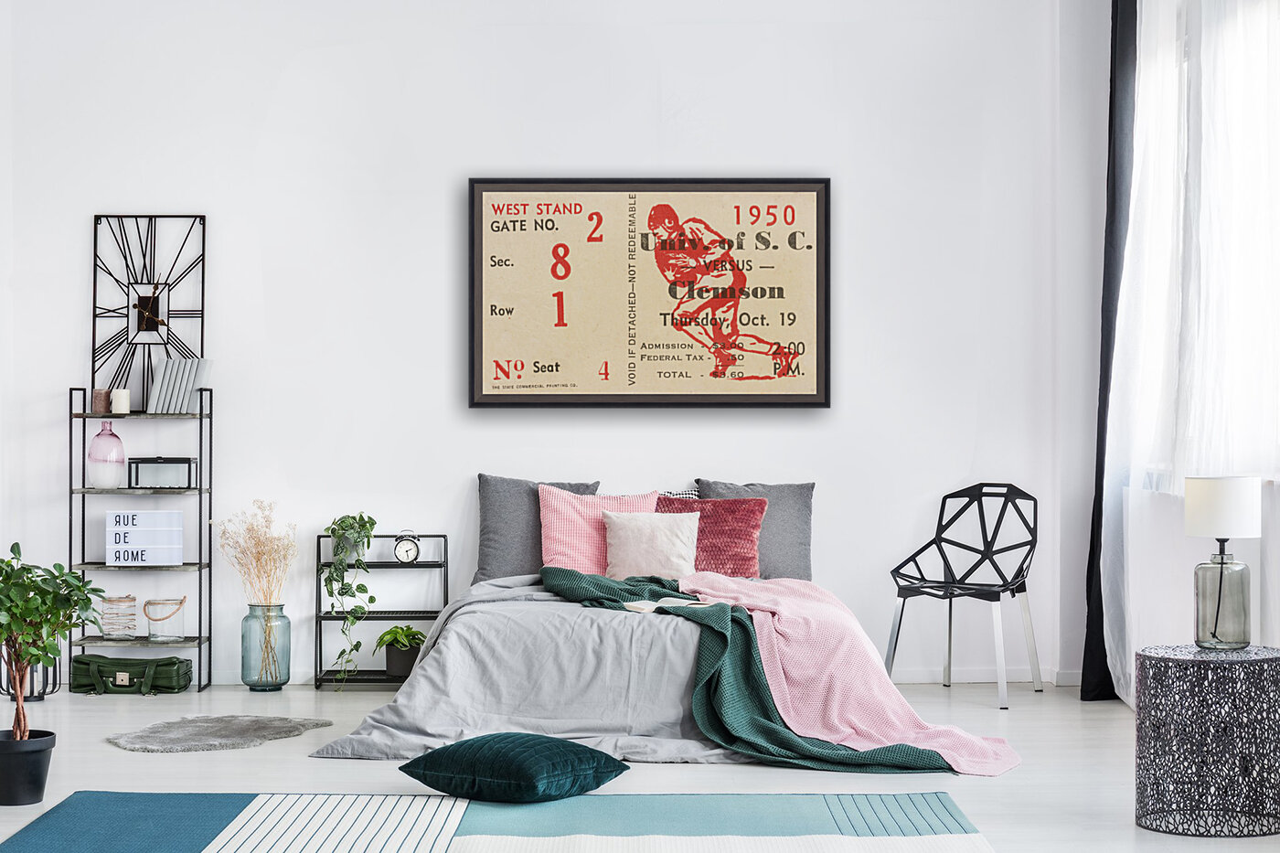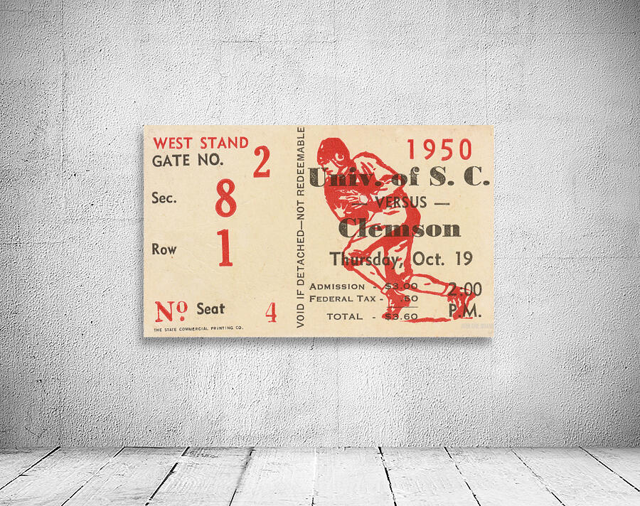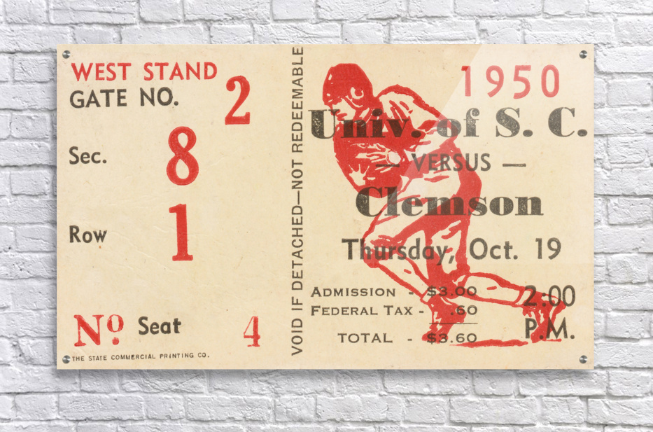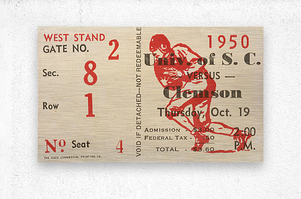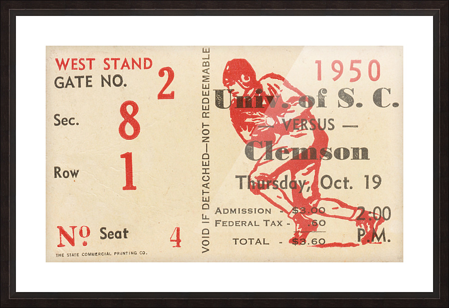 1950 #12 Clemson vs. South Carolina | The Gamecocks and Tigers tied 14-14 on a rain soaked field. Clemson drove 70 yards in the final three minutes to tie the game. (Greenville News, October 20, 1950) Clemson finished 9-0-1 and was Orange Bowl Champion. This Row One Brand vintage college football ticket art will look fantastic in your game room or office. Row One Brand's historic college football ticket stub wall art prints are not affiliated with, licensed, sponsored, authorized, or endorsed by any college, university, team, league, other artist, athlete, other brand, or any licensing entity. Only non-copyrighted ticket stubs dating back to 1893 are used by Row 1 to create our historic sports ticket art prints. Row One Brand | 5,700 Historic Sports Wall Art Prints | 1.5 Million Gallery Views | Row 1 |
