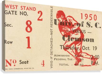 1950 CLEMSON TIGERS VS. SOUTH CAROLINA GAMECOCKS ROW ONE BRAND  Canvas Print