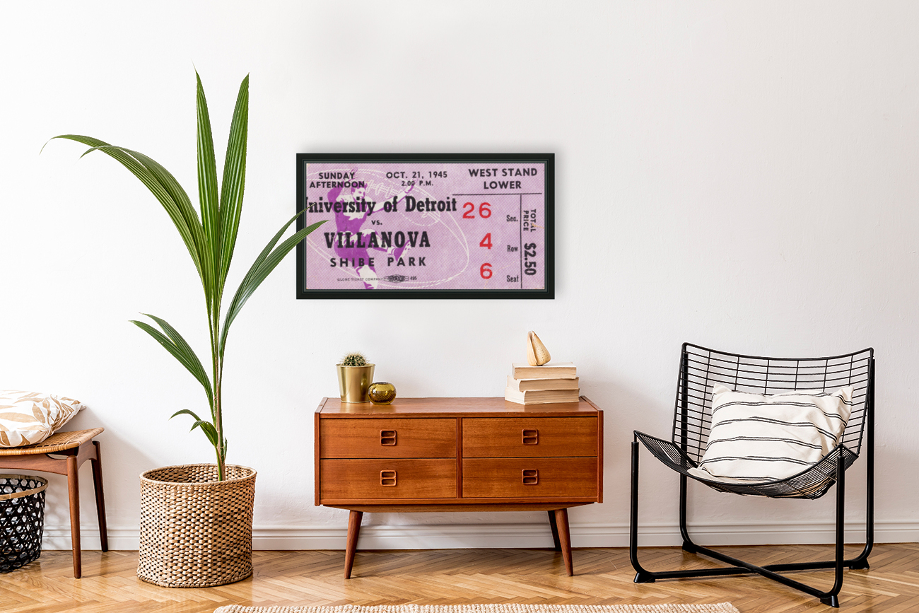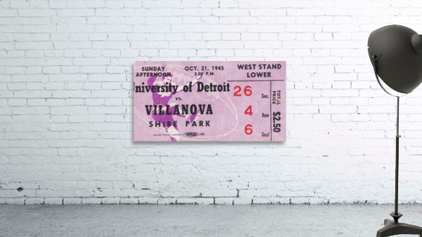 1945 Detroit Titans vs. Villanova Wildcats Football Ticket Art | Row 1 | 5,800 Historic Sports Prints | 1.6 Million Gallery Views | The Villanova Wildcats beat the Detroit Titans 14-0 in front of a crowd of 11,000 at historic Shibe Park in Philadelphia. This Row One Brand vintage college football ticket wall art will look terrific in your game room or office. Row One Brand's historic college football art prints are not affiliated with, licensed, sponsored, authorized, or endorsed by any college, university, team, league, other artist, athlete, other brand, or any licensing entity. Only non-copyrighted football memorabilia dating back to 1876 is used by Row 1 to create our historic college football wall art prints. Derivative art © 2021 Row One Brand