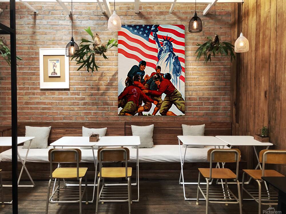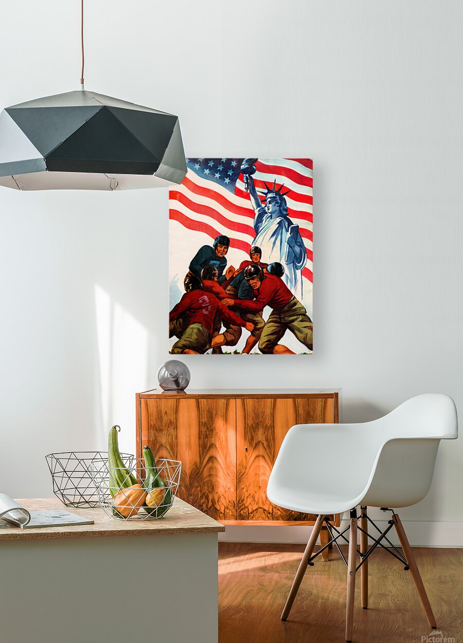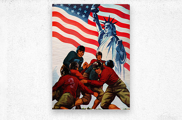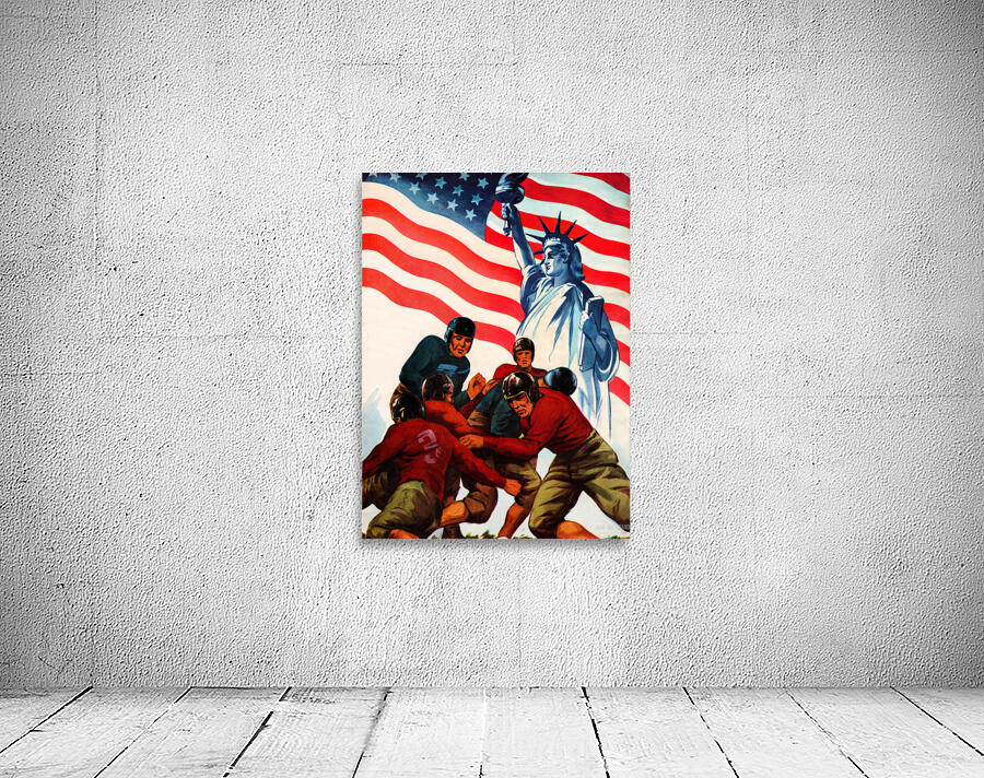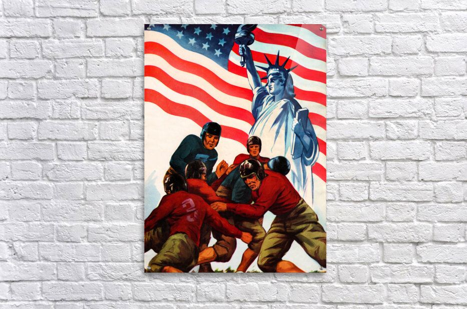 Early Black Friday Sale 2021 | Black Friday Sports Gift Ideas Row One | 6,200 Historic Sports Art Prints | 2 Million Gallery Views | Row 1 | 1945 Vintage American Patriotic Football Art | This Row One Brand 1945 World War II Era vintage football patriotic art was created from authentic 1945 football program cover art in our collection. Row 1's vintage Statue of Liberty patriotic gridiron art will look terrific in your game room or office. Row One Brand historic vintage football art prints are not affiliated with, licensed, sponsored, authorized, or endorsed by any college, university, team, league, other artist, athlete, other brand, or any licensing entity. Only non-copyrighted football memorabilia art is used by Row One to create our historic football wall art prints. Derivative art © 2021 Row One Brand